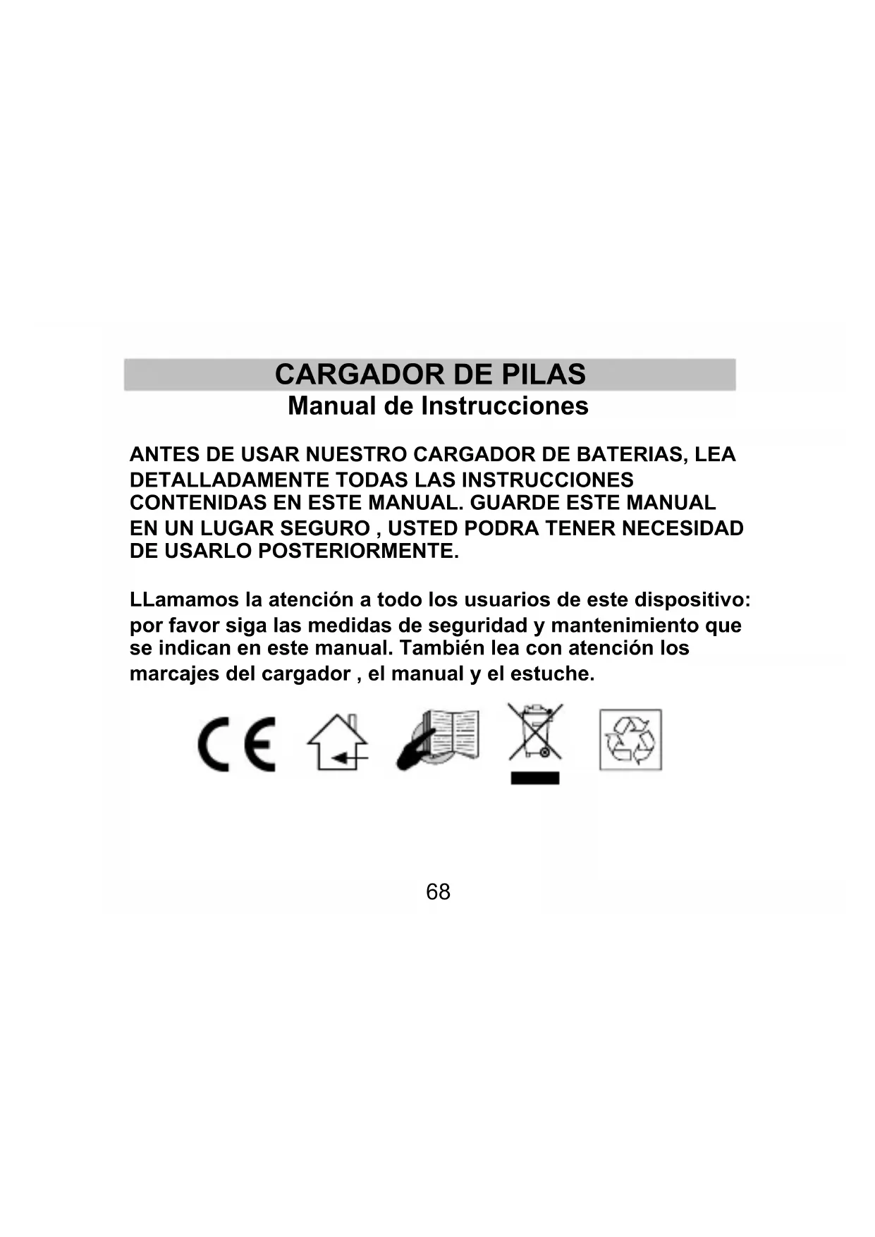 CONTENIDAS EN ESTE MANUAL. GUARDE ESTE MANUAL EN UN LUGAR SEGURO , USTED PODRA TENER NECESIDAD DE USARLO POSTERIORMENTE. LLamamos la atención a todo los usuarios de este dispositivo: por favor siga las medidas de seguridad y mantenimiento que se indican en este manual. También lea con atención los marcajes del cargador , el manual y el estuche.69