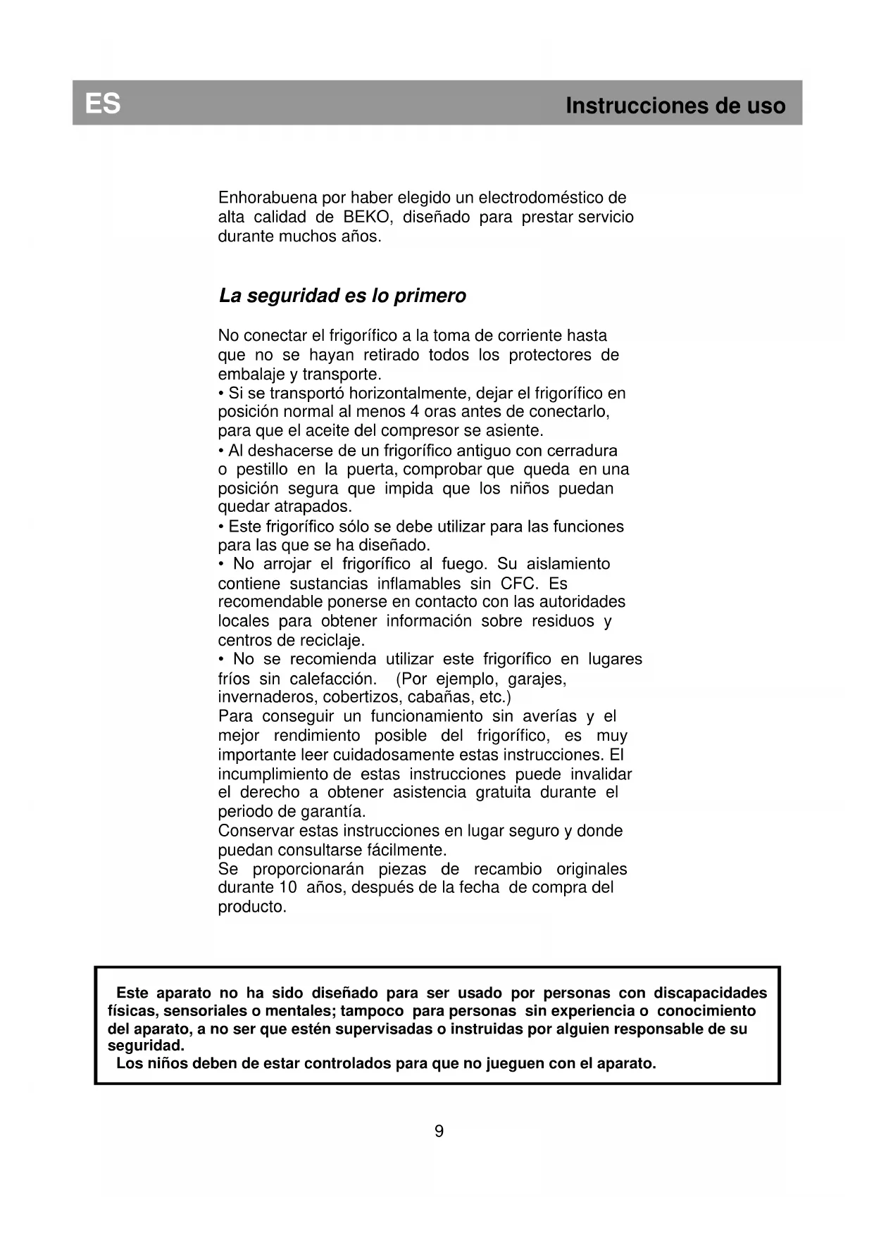 Este aparato no ha sido diseñado para ser usado por personas con discapacidades físicas, sensoriales o mentales; tampoco para personas sin experiencia o conocimiento del aparato, a no ser que estén supervisadas o instruidas por alguien responsable de su seguridad. Los niños deben de estar controlados para que no jueguen con el aparato.ES Instrucciones de uso