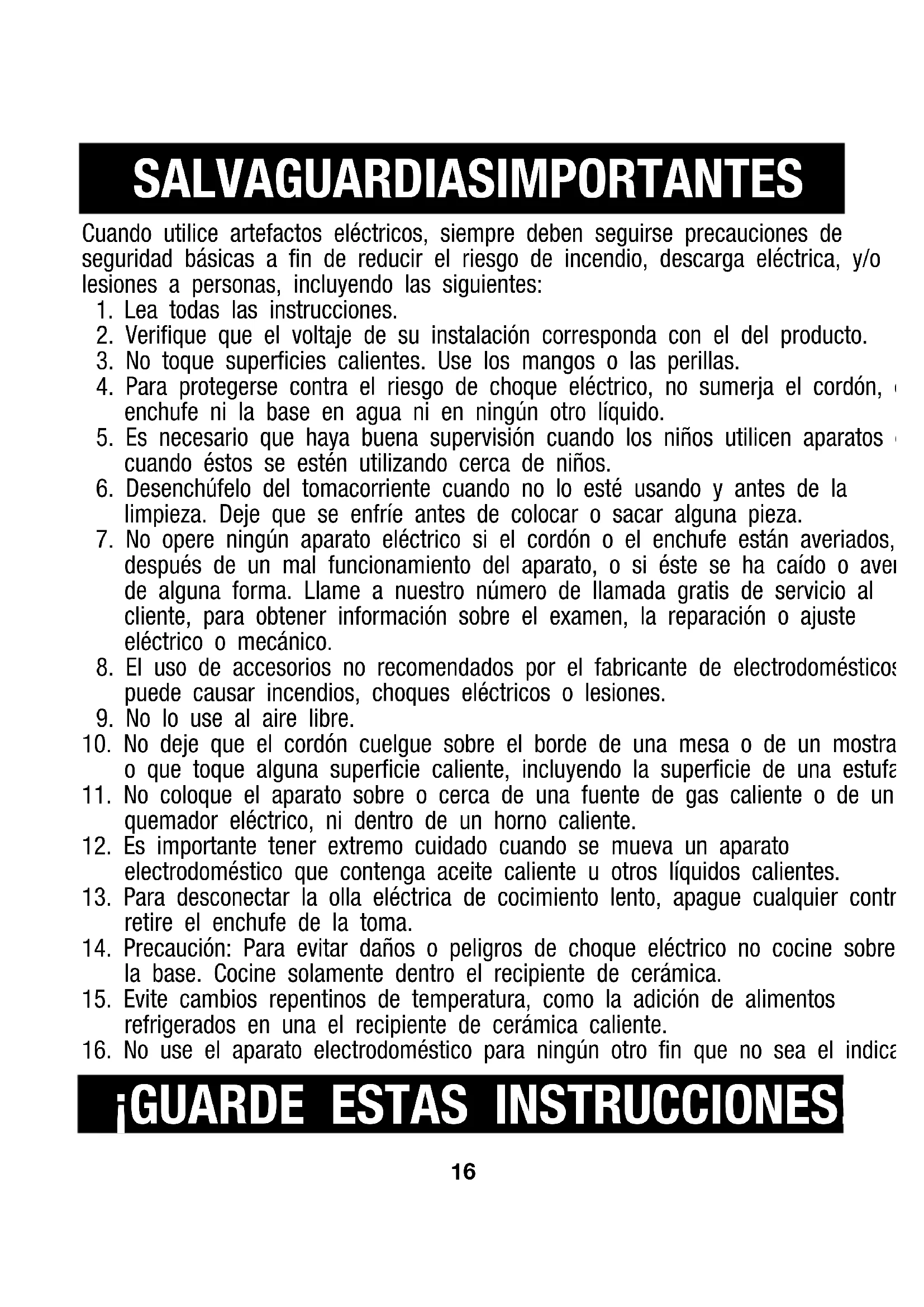 Este aparato ha sido diseñado solamente para uso doméstico. Este producto está concebido para la preparación, cocción y servicio de alimentos. Este producto no está concebido para su uso con materiales o productos no alimenticios. ¡ADVERTENCIA! Peligro de descarga eléctrica: Este aparato cuenta con un enchufe polarizado (una pata más ancha) que reduce el riesgo de una descarga eléctrica. El enchufe embona únicamente en una dirección dentro de un tomaco- rriente polarizado. No trate de obviar el propósito de seguridad del enchufe modificándolo de alguna manera o utilizando un adaptador. Si el enchufe no embona, inviértalo. Si aún así no embona, llame a un electricista para que reemplace el tomacorriente. El largo del cable que se usa en este aparato fue seleccionado para reducir el peligro de que alguien se enganche o tropiece con un cable más largo. Si es necesario usar un cable más largo, se podrá usar un cable de extensión aprobado. Las especificaciones eléctricas nominales del cable de extensión debe ser igual o mayor que la especificaciones nominal de la cafetera. Es importante tener cuidado de colocar el cable de extensión para que no se pliegue sobre el mesa o la mesera en donde niños puedan tirar del mismo o tropezarse accidentalmente.18 TAPA Y OLLA: