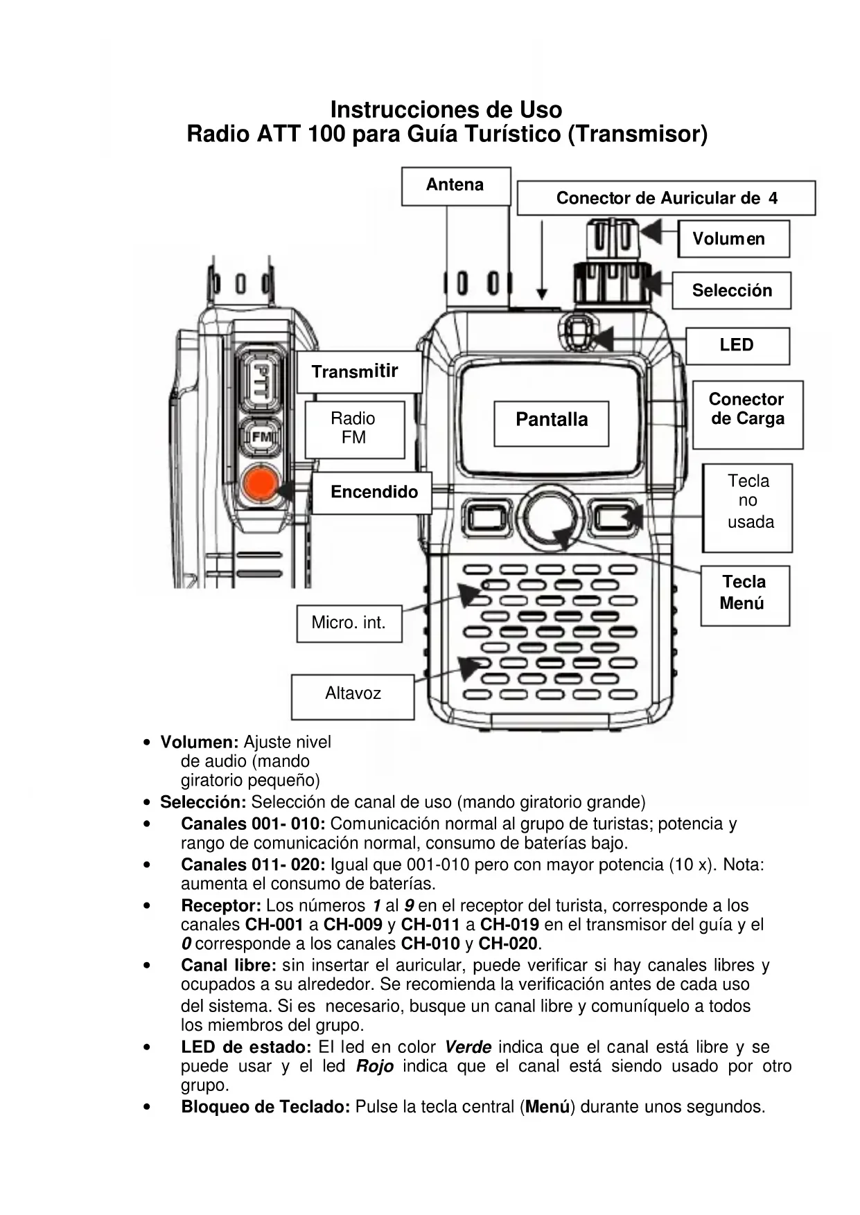 - Receptor: Los números 1 al 9 en el receptor del turista, corresponde a los canales CH-001 a CH-009 y CH-011 a CH-019 en el transmisor del guía y el 0 corresponde a los canales CH-010 y CH-020.