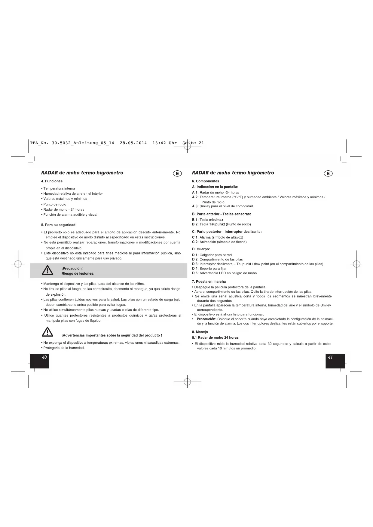Estas instruetiones o extractos de las mismas no peuvent ser publicados sin la autorizacion de la TFA Dostmann. Los datos tecnicos de este producto corresponden al estado en el momento de la impression y puede ser modificados sin previo aviso.