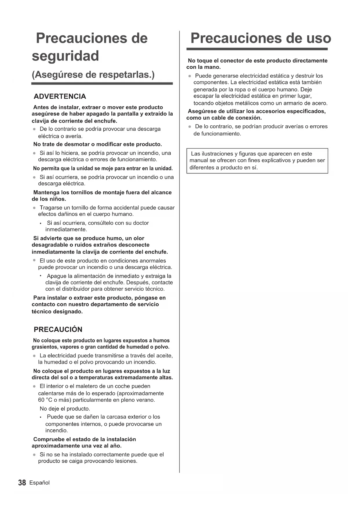 Antes de instalar, extraer o mover este producto asegúrese de haber apagado la pantalla y extraído la clavija de corriente del enchufe.