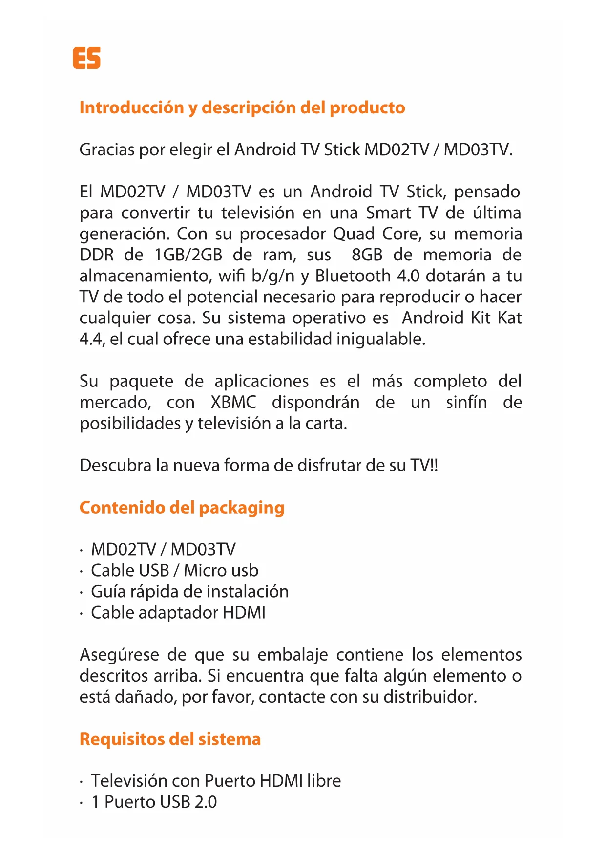 - Please ensure that both the MD02TV / MD03TV and the Smartphone are running on the same Wi network.EN Note: Billow Technology is not responsible or owner of the installed applications, or its contents and as such, the maintenance of these applications is not associated with the brand. Technical Support For more information on installing and conguring this product go to our website www.billowtechnology.com or write an email to support@billowtechnology.comES Introducción y descripción del producto Gracias por elegir el Android TV Stick MD02TV / MD03TV. El MD02TV / MD03TV es un Android TV Stick, pensado para convertir tu televisión en una Smart TV de última generación. Con su procesador Quad Core, su memoria DDR de 1GB/2GB de ram, sus 8GB de memoria de almacenamiento, wi b/g/n y Bluetooth 4.0 dotarán a tu TV de todo el potencial necesario para reproducir o hacer cualquier cosa. Su sistema operativo es Android Kit Kat 4.4, el cual ofrece una estabilidad inigualable. Su paquete de aplicaciones es el más completo del mercado, con XBMC dispondrán de un sinfín de posibilidades y televisión a la carta. Descubra la nueva forma de disfrutar de su TV!! Contenido del packaging