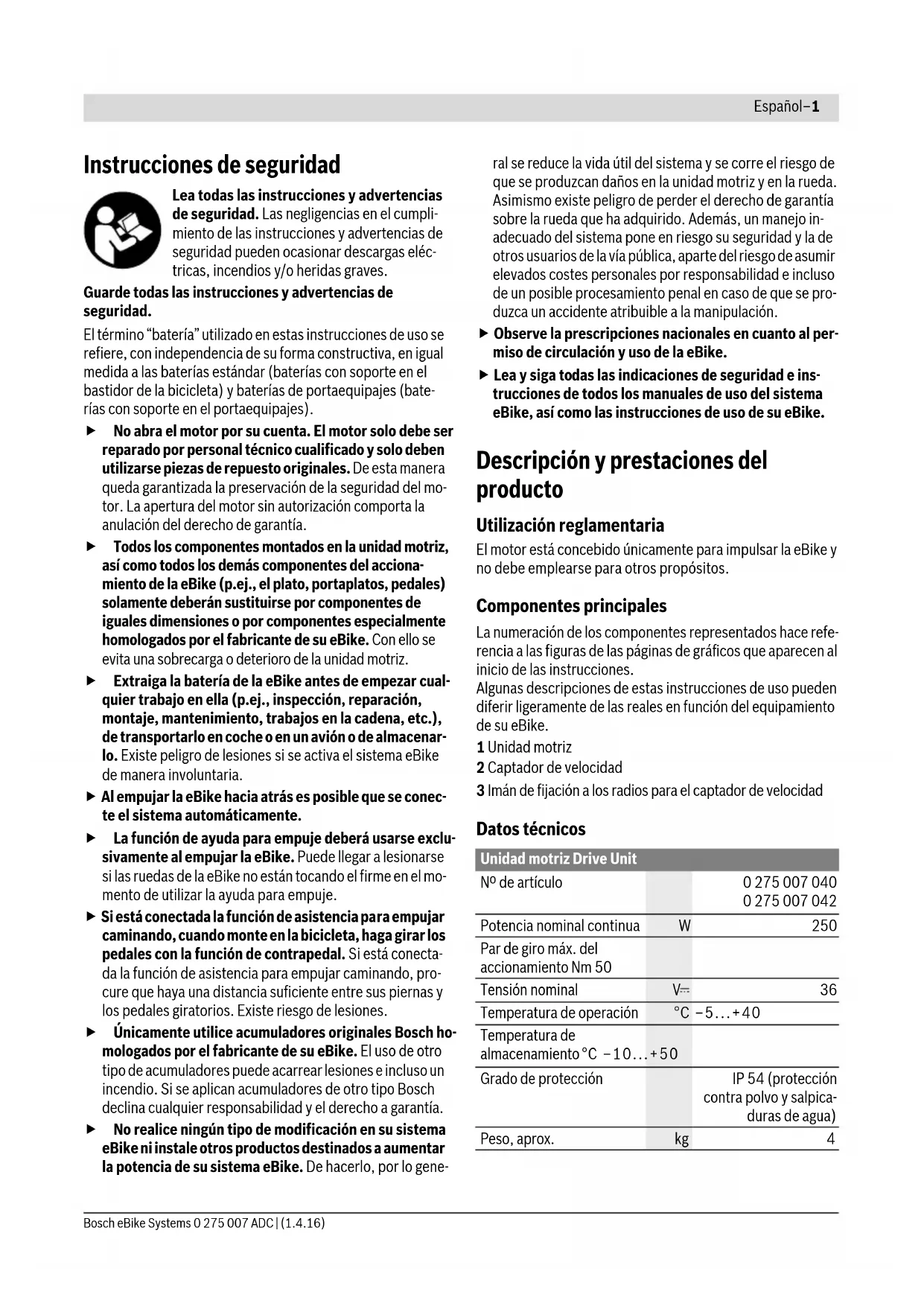 Potencia nominal continua W250 Par de giro máx. del accionamiento Nm 50 Tensión nominal V36 Temperatura de operación °C –5...+40 Temperatura de almacenamiento °C –10...+50 Grado de protección IP 54 (protección contra polvo y salpica- duras de agua) Peso, aprox. kg 4Español–2 0 275 007 ADC | (1.4.16) Bosch eBike Systems Montaje Colocar y retirar la batería Para colocar y retirar la batería de la eBike, lea y observe las instrucciones de uso de la batería. Comprobación del captador de velocidad (ver figura A) El captador de velocidad 2 y el imán de fijación a los radios 3 deberán montarse de forma que éste se encuentre a una dis- tancia entre 5 mm y máximo 17 mm al quedar encarado con el captador de velocidad. Observación: Si la distancia entre el sensor de velocidad 2 y el imán de fijación a los radios 3 es demasiado pequeña o de- masiado grande, o si el sensor de velocidad 2 no está conec- tado correctamente, fallará la indicación del tacómetro y el accionamiento de la eBike funcionará con el programa de emergencia. En este caso, desenrosque el tornillo del imán de fijación a los radios 3 y fíjelo al radio de forma que pase por la marca del sensor de velocidad a la distancia correcta. Si aun así sigue sin aparecer la velocidad en el indicador del tacómetro, diríja- se a un distribuidor de bicicletas autorizado. Operación Puesta en marcha Requisitos El sistema eBike solo puede activarse cuando se cumplen las siguientes condiciones: – Se ha colocado una batería con suficiente carga (véanse las instrucciones de uso de la batería). – El ordenador de a bordo está colocado correctamente en el soporte (véanse las instrucciones de uso del ordenador de a bordo). – El sensor de velocidad está conectado correctamente (véase “Comprobación del captador de velocidad”, página Español–2). Conexión y desconexión del sistema de la eBike El sistema de la eBike se puede conectar de las siguientes formas: – Si el ordenador de a bordo ya está conectado al colocarlo en el soporte, el sistema eBike se enciende automática- mente. – Cuando estén colocados el ordenador de a bordo y la bate- ría de la eBike, pulse una vez brevemente la tecla de encen- dido/apagado del ordenador de a bordo (véanse las ins- trucciones de uso del ordenador de a bordo). – Cuando el ordenador de a bordo esté colocado, pulse la te- cla de encendido/apagado de la batería de la eBike (véan- se las instrucciones de uso de la batería). El accionamiento se activa al empezar a pedalear (excepto en la función de asistencia para empujar caminando, véase “Conexión/desconexión de la Ayuda para empuje”, página Español–3). La potencia del motor depende del nivel de asis- tencia ajustado en el ordenador de a bordo. Durante el funcionamiento normal de la eBike el accionamien- to de la misma se desactiva en el momento de que Ud. deje de pedalear o alcance una velocidad de 25 km/h. El acciona- miento vuelve a reactivarse automáticamente al volver a pe- dalear, siempre que la velocidad de marcha sea inferior a 25 km/h. El sistema de la eBike se puede desconectar de las siguientes formas: – Pulse la tecla de encendido/apagado del ordenador de a bordo. – Desconecte la batería de la eBike mediante su tecla de encendido/apagado (véanse las instrucciones de uso de la batería). – Retire el ordenador de a bordo del soporte. Si transcurren unos 10 min sin mover la eBike y sin pulsar nin- guna tecla en el ordenador de a bordo, el sistema de la eBike se desconecta de forma automática para ahorrar energía. eShift (opcional) eShift es la integración de los sistemas de conexión/desco- nexión automática en el sistema de la eBike. Los componentes eShift están conectados eléctricamente de fábrica con el mo- tor. El manejo de los sistemas automáticos de cambio se descri- be en las instrucciones de uso del ordenador de a bordo. Ajuste del modo de asistencia En el ordenador de a bordo puede ajustar el nivel de asisten- cia del motor de la eBike al pedalear. Este nivel de asistencia se puede modificar en cualquier momento, también durante la marcha. Observación: En ciertas ejecuciones puede que venga preajustado fijo el modo de asistencia y no sea posible modi- ficarlo. También es posible que no exista una diversidad de modos de asistencia tan amplia como la aquí indicada. Iluminación de la bicicleta