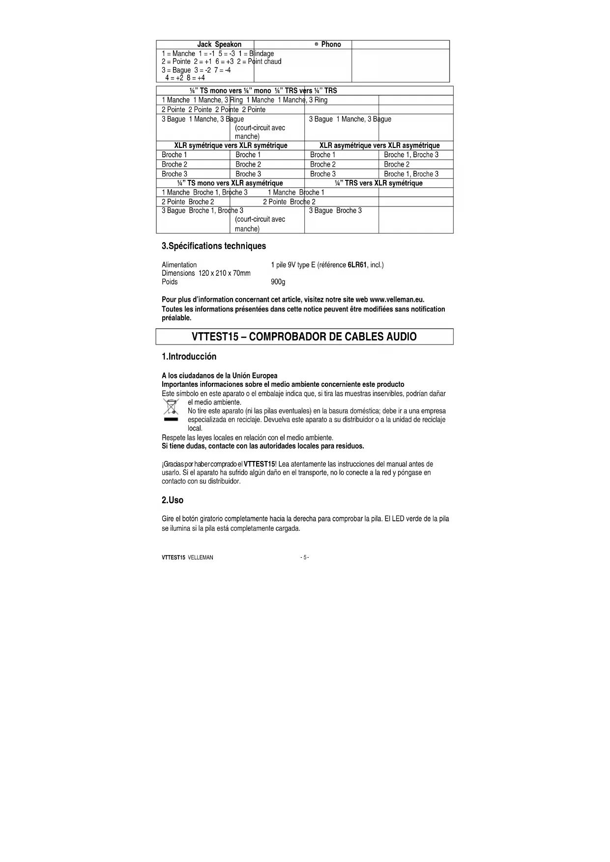 VTTEST15 - Probador de cables de audio VELLEMAN - Manual de uso y guía de instrucciones gratis