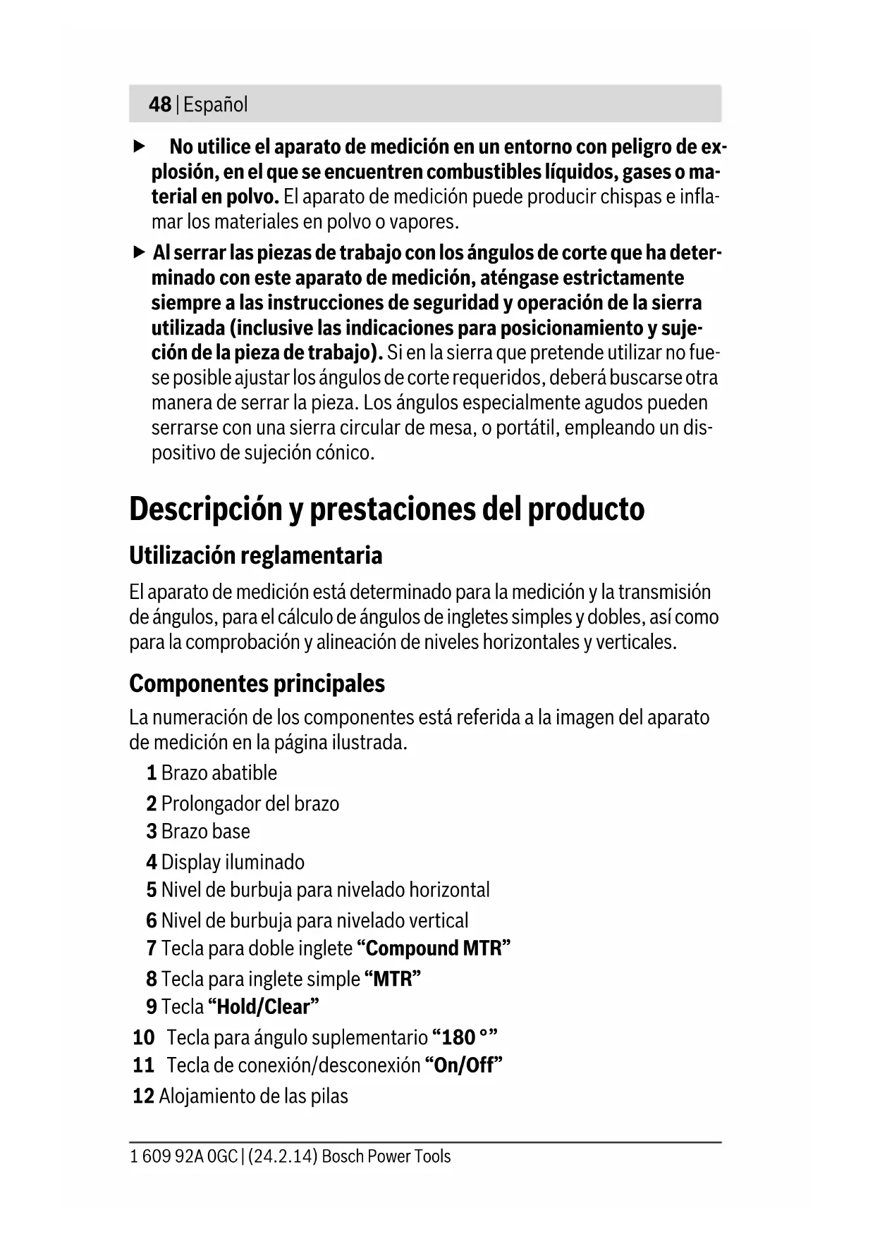 OBJ_BUCH-2116-002.book Page 53 Monday, February 24, 2014 10:56 AM54 | Español 1 609 92A 0GC | (24.2.14) Bosch Power Tools Se calcula el ángulo de inglete horizontal “MTR” (“Miter Angle”: ángulo de inglete horizontal ) con el que deban cortarse ambas piezas. En este tipo de cortes a inglete, la hoja de sierra deberá estar posicionada perpendicu- larmente a la pieza (ángulo de inglete vertical de 0°). MTR MTR
