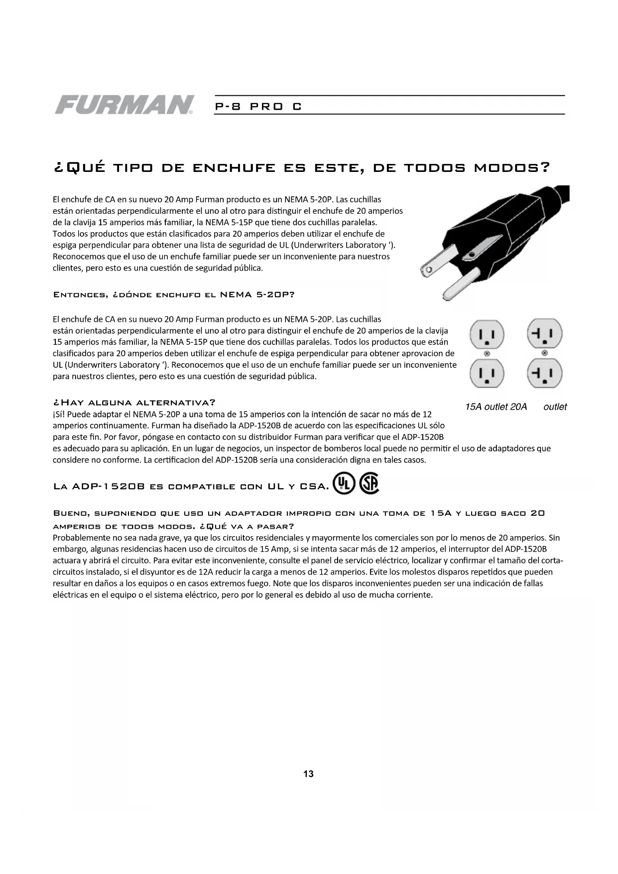 ALL CONTENT ©2013 FURMAN. ALL RIGHTS RESERVED. PRINTED IN CHINA. © 2013 Core Brands LLC, All rights reserved. Furman is a registered trademark of Core Brands, LLC, a subsidiary of Nortek, Inc.El enchufe de CA en su nuevo 20 Amp Furman producto es un NEMA 5-20P. Las cuchillas están orientadas perpendicularmente el uno al otro para disnguir el enchufe de 20 amperios de la clavija 15 amperios más familiar, la NEMA 5-15P que ene dos cuchillas paralelas. Todos los productos que están clasicados para 20 amperios deben ulizar el enchufe de espiga perpendicular para obtener una lista de seguridad de UL (Underwriters Laboratory ‘). Reconocemos que el uso de un enchufe familiar puede ser un inconveniente para nuestros clientes, pero esto es una cuesón de seguridad pública. Entonces, ¿dónde enchufo el NEMA 5-20P? El enchufe de CA en su nuevo 20 Amp Furman producto es un NEMA 5-20P. Las cuchillas están orientadas perpendicularmente el uno al otro para disnguir el enchufe de 20 amperios de la clavija 15 amperios más familiar, la NEMA 5-15P que ene dos cuchillas paralelas. Todos los productos que están clasicados para 20 amperios deben ulizar el enchufe de espiga perpendicular para obtener aprovacion de UL (Underwriters Laboratory ‘). Reconocemos que el uso de un enchufe familiar puede ser un inconveniente para nuestros clientes, pero esto es una cuesón de seguridad pública. ¿Hay alguna alternativa? ¡Sí! Puede adaptar el NEMA 5-20P a una toma de 15 amperios con la intención de sacar no más de 12 amperios connuamente. Furman ha diseñado la ADP-1520B de acuerdo con las especicaciones UL sólo para este n. Por favor, póngase en contacto con su distribuidor Furman para vericar que el ADP-1520B es adecuado para su aplicación. En un lugar de negocios, un inspector de bomberos local puede no permir el uso de adaptadores que considere no conforme. La cercacion del ADP-1520B sería una consideración digna en tales casos. La ADP-1520B es compatible con UL y CSA. Bueno, suponiendo que uso un adaptador impropio con una toma de 15A y luego saco 20 amperios de todos modos. ¿Qué va a pasar? Probablemente no sea nada grave, ya que los circuitos residenciales y mayormente los comerciales son por lo menos de 20 amperios. Sin embargo, algunas residencias hacen uso de circuitos de 15 Amp, si se intenta sacar más de 12 amperios, el interruptor del ADP-1520B actuara y abrirá el circuito. Para evitar este inconveniente, consulte el panel de servicio eléctrico, localizar y conrmar el tamaño del corta- circuitos instalado, si el disyuntor es de 12A reducir la carga a menos de 12 amperios. Evite los molestos disparos repedos que pueden resultar en daños a los equipos o en casos extremos fuego. Note que los disparos inconvenientes pueden ser una indicación de fallas eléctricas en el equipo o el sistema eléctrico, pero por lo general es debido al uso de mucha corriente. ¿Qué tipo de enchufe es este, de todos modos? 15A outlet 20A outlet 15A outlet 20A outlet 15A outlet 20A outlet