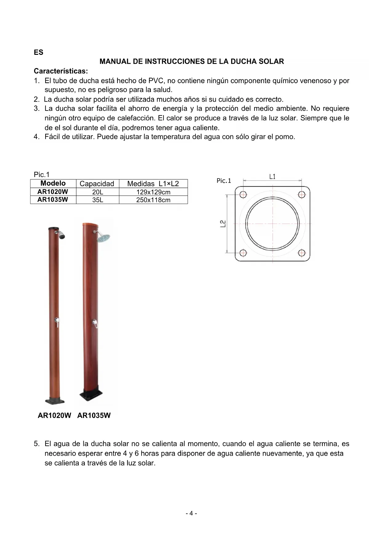 - La ducha solar podría ser utilizes muchos años si su cuidado es correcto.