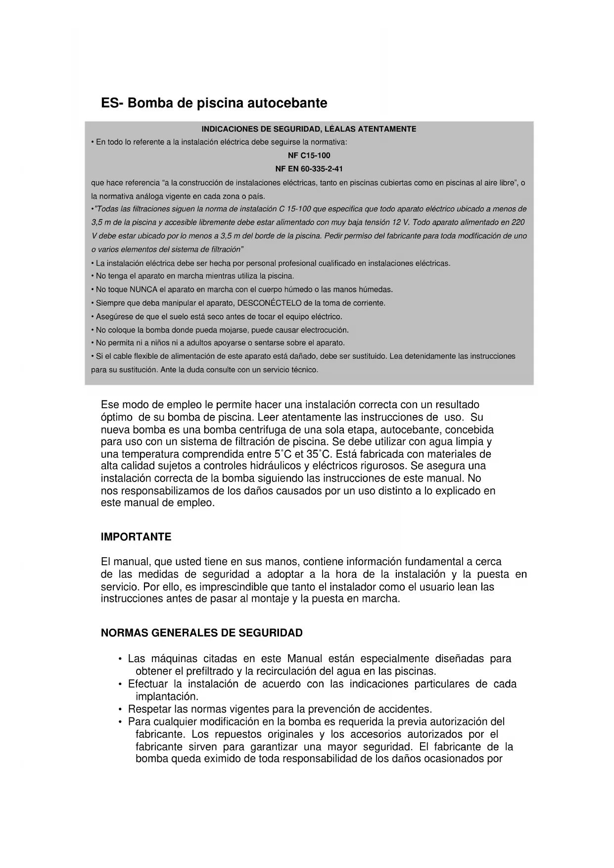 Ese modo de empleo le permite hacer una instalacion correcta con un resultado optimo de su bomba de piscina. Leer atentamente las instrucciones de uso. Suueva bomba es una bomba centrifuga de una sola etapa, autocebante, concebida para uso con un systeme de filtracion de piscina. Se debe utilizes con agua limpia y una temperatura comprehenda entre 5^ et 35^ . Está fabricada con materiales de alta calidad susertos a 控ules hidráulicos y electricos rigurosos. Se asegura una instalacion correcta de la bomba siguiendo las instrucciones de este manual. No nos responsabilizamos de los danios causados por un usodistincto lo explicado en este manual de empleo.