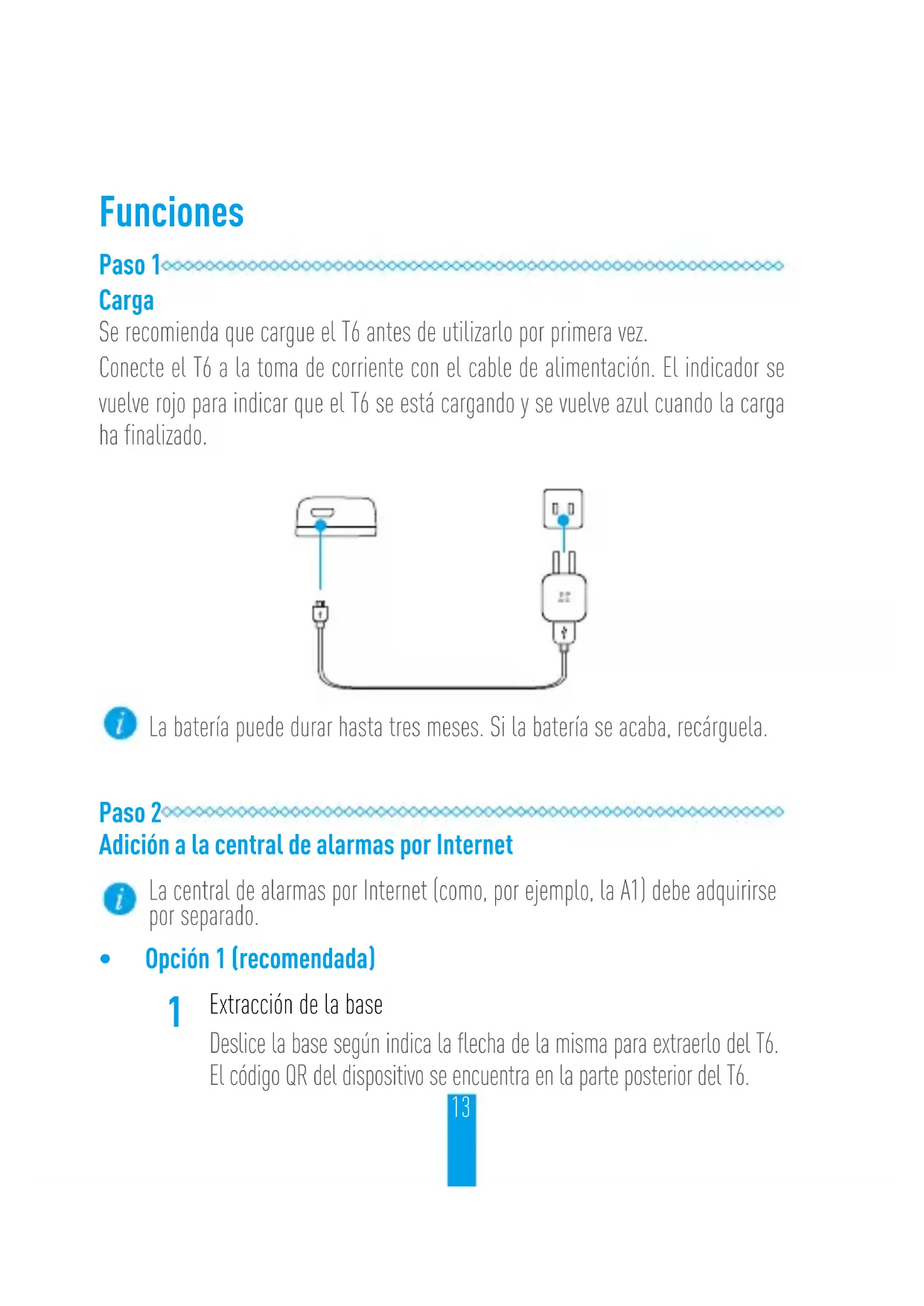 10dBm Taste Sockel Ladeschnittstelle LED-Anzeige Blinkt einmal blau: Tür oder Fenster kehrt in den Geschlossen-Status zurück Blinkt einmal rot: Tür oder Fenster ist geöffnet13 Funciones Paso 1 Carga Se recomienda que cargue el T6 antes de utilizarlo por primera vez. Conecte el T6 a la toma de corriente con el cable de alimentación. El indicador se vuelve rojo para indicar que el T6 se está cargando y se vuelve azul cuando la carga ha finalizado. La batería puede durar hasta tres meses. Si la batería se acaba, recárguela. Paso 2 Adición a la central de alarmas por Internet La central de alarmas por Internet (como, por ejemplo, la A1) debe adquirirse por separado.