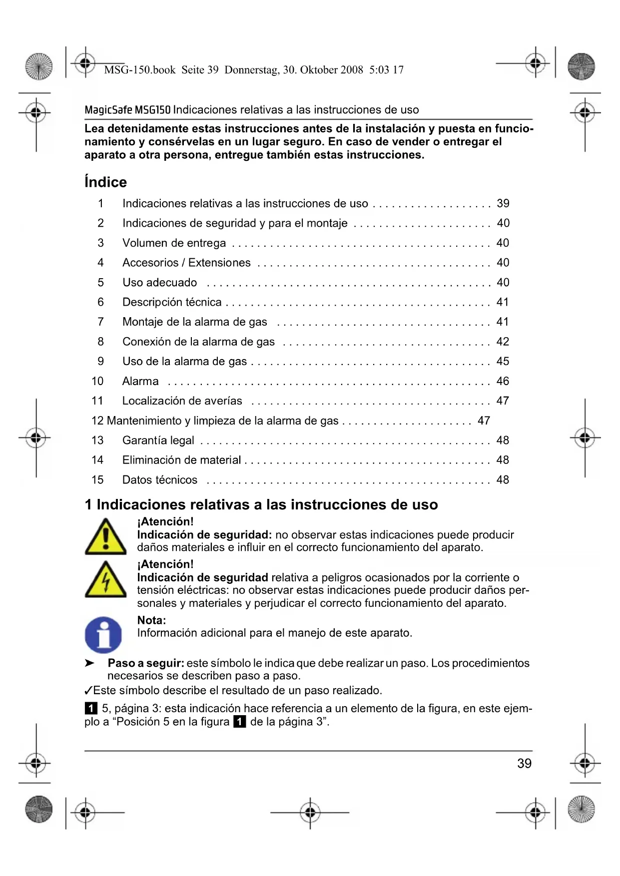 - 15 Datos técnicos 1 Indicaciones relativas a las instrucciones de uso ¡Atención! Indicación de seguridad: no observar estas indicaciones puede producir daños materiales e influir en el correcto funcionamiento del aparato. ¡Atención! Indicación de seguridad relativa a peligros ocasionados por la corriente o tensión eléctricas: no observar estas indicaciones puede producir daños per- sonales y materiales y perjudicar el correcto funcionamiento del aparato. Nota: Información adicional para el manejo de este aparato. ➤ Paso a seguir: este símbolo le indica que debe realizar un paso. Los procedimientos necesarios se describen paso a paso. ✓ Este símbolo describe el resultado de un paso realizado. 1 5, página 3: esta indicación hace referencia a un elemento de la figura, en este ejem- plo a “Posición 5 en la figura 1 de la página 3”. MSG-150.book Seite 39 Donnerstag, 30. Oktober 2008 5:03 17Indicaciones de seguridad y para el montaje MagicSafe MSG150 p. 48