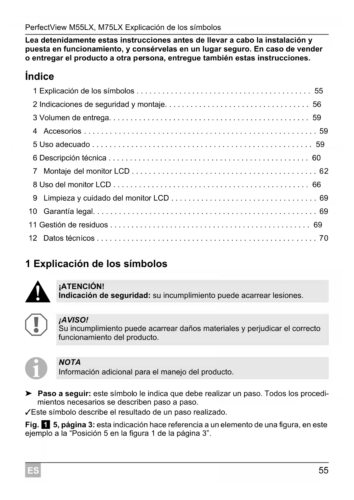➤ Paso a seguir: este símbolo le indica que debe realizar un paso. Todos los procedi- mientos necesarios se describen paso a paso. ✓ Este símbolo describe el resultado de un paso realizado. Fig. 1 5, página 3: esta indicación hace referencia a un elemento de una figura, en este ejemplo a la “Posición 5 en la figura 1 de la página 3”. ¡ATENCIÓN! Indicación de seguridad: su incumplimiento puede acarrear lesiones. ¡AVISO! Su incumplimiento puede acarrear daños materiales y perjudicar el correcto funcionamiento del producto. NOTA Información adicional para el manejo del producto.Indicaciones de seguridad y montaje PerfectView M55LX, M75LX