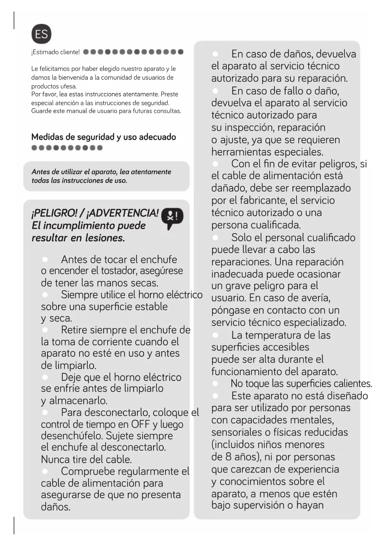 4¡Estimado cliente! Le felicitamos por haber elegido nuestro aparato y le damos la bienvenida a la comunidad de usuarios de productos ufesa. Por favor, lea estas instrucciones atentamente. Preste especial atención a las instrucciones de seguridad. Guarde este manual de usuario para futuras consultas. Medidas de seguridad y uso adecuado Antes de utilizar el aparato, lea atentamente todas las instrucciones de uso. ¡PELIGRO! / ¡ADVERTENCIA! El incumplimiento puede resultarenlesiones. ● Antes de tocar el enchufe oencender el tostador, asegúrese de tener las manos secas. ● Siempre utilice el horno eléctrico sobre una superficie estable yseca. ● Retire siempre el enchufe de la toma de corriente cuando el aparato no esté en uso y antes de limpiarlo. ● Deje que el horno eléctrico se enfríe antes de limpiarlo yalmacenarlo. ● Para desconectarlo, coloque el control de tiempo en OFF y luego desenchúfelo. Sujete siempre el enchufe al desconectarlo. Nunca tire del cable. ● Compruebe regularmente el cable de alimentación para asegurarse de que no presenta daños. ● En caso de daños, devuelva el aparato al servicio técnico autorizado para su reparación. ● En caso de fallo o daño, devuelva el aparato al servicio técnico autorizado para su inspección, reparación oajuste, ya que se requieren herramientas especiales. ● Con el fin de evitar peligros, si el cable de alimentación está dañado, debe ser reemplazado por el fabricante, el servicio técnico autorizado o una persona cualificada. ● Solo el personal cualificado puede llevar a cabo las reparaciones. Una reparación inadecuada puede ocasionar un grave peligro para el usuario. En caso de avería, póngase en contacto con un servicio técnico especializado. ● La temperatura de las superficies accesibles puede ser alta durante el funcionamiento del aparato. ● No toque las superficies calientes. ● Este aparato no está diseñado para ser utilizado por personas con capacidades mentales, sensoriales o físicas reducidas (incluidos niños menores de 8 años), nipor personas que carezcan de experiencia yconocimientos sobre el aparato, amenos que estén bajo supervisión ohayan ESrecibido la formación adecuada sobre el uso seguro de este aparato y de sus riesgos. Los niños no deberían jugar con el aparato. Los niños no deberían llevar a cabo la limpieza y el mantenimiento del aparato amenos que hayan cumplido 8años yestén bajo supervisión. ● Mantenga el aparato con su cable de alimentación fuera del alcance de los niños menores de 8 años. ● Nunca sumerja ninguna parte del horno eléctrico, el cable de alimentación ni el enchufe en agua u otro líquido. ● Nunca utilice el aparato si el cable o el enchufe presentan daños, obien si se detectan fallos en el funcionamiento odaños en el aparato. ● El aparato genera calor durante el funcionamiento. Debe mantener las precauciones apropiadas para prevenir el riesgo de lesiones, quemaduras, incendios u otros daños al cuerpo o a objetos causados por el contacto con las superficies externas durante el uso o enfriamiento. ● Utilice el tirador de la puerta para abrir y cerrar la puerta del horno. ● Utilice el asa de transporte para insertar o extraer la bandeja del horno. ● Tenga mucho cuidado al retirar la bandeja o al eliminar el aceite caliente de la bandeja. ● No coloque ninguno de los siguientes materiales encima del aparato: cartón, plástico, papel, vela o materiales inflamables. ● No coloque objetos pesados sobre la puerta abierta. ● No salpique agua sobre el vidrio durante el uso oinmediatamente después. Esto puede provocar que el vidrio se rompa. ● Utilizar el aparato sólo en recintos interiores yatemperatura ambiente yno utilizarlo por encima de los 2000 m sobre el nivel del mar. ● – La temperatura de las superficies accesibles puede ser alta durante el funcionamiento del aparato. Notoque la superficie marcada con el símbolo. ¡ATENCIÓN! El incumplimiento de estas instrucciones puede resultar en daños materiales