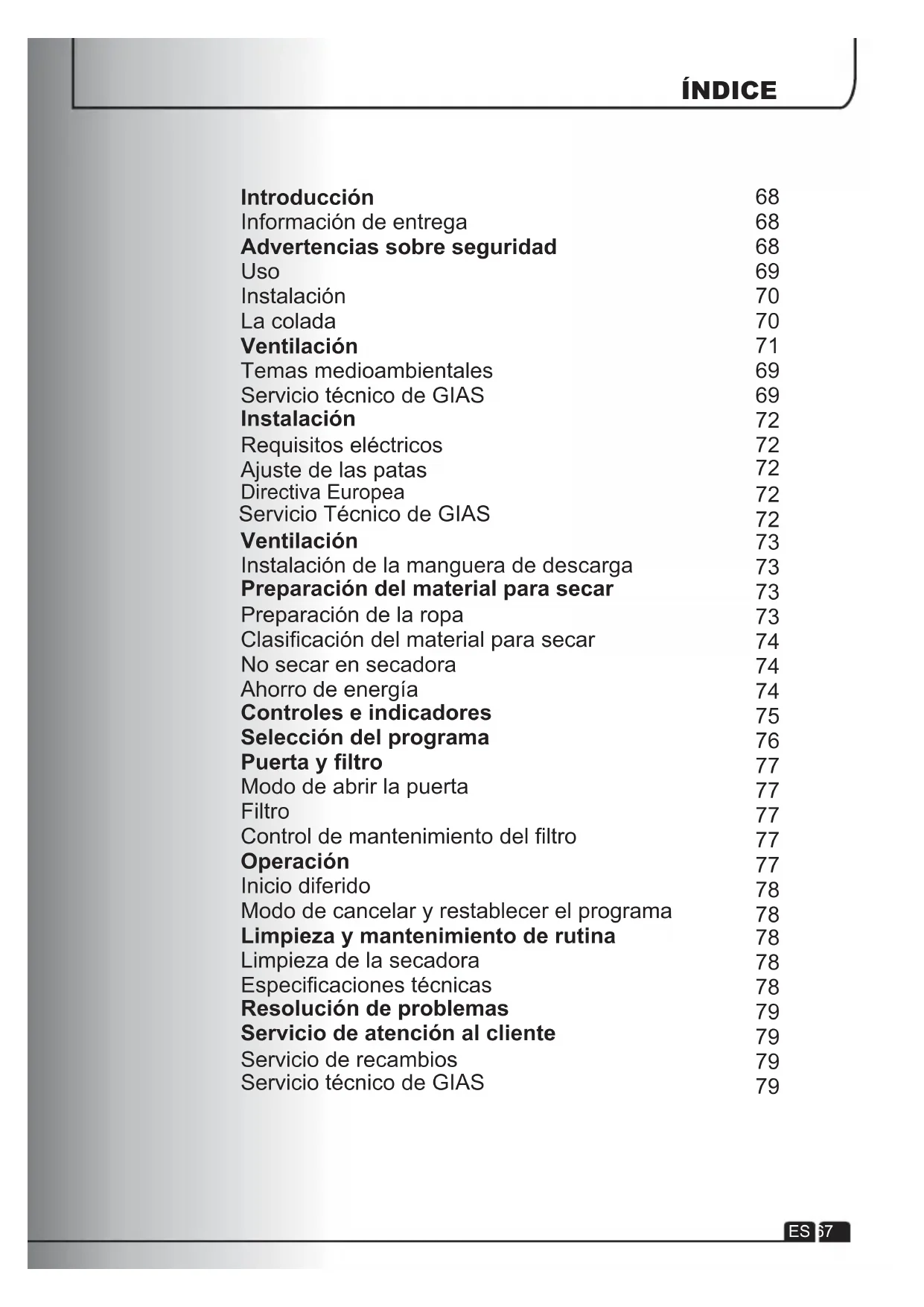 66Introducción Información de entrega Advertencias sobre seguridad Uso Instalación La colada Ventilación Temas medioambientales Servicio técnico de GIAS Instalación Requisitos eléctricos Ajuste de las patas Directiva Europea Ventilación Instalación de la manguera de descarga Preparación del material para secar Preparación de la ropa Clasificación del material para secar No secar en secadora Ahorro de energía Controles e indicadores Selección del programa Puerta y filtro Modo de abrir la puerta Filtro Control de mantenimiento del filtro Operación Inicio diferido Modo de cancelar y restablecer el programa Limpieza y mantenimiento de rutina Limpieza de la secadora Especificaciones técnicas Resolución de problemas Servicio de atención al cliente Servicio de recambios Servicio técnico de GIAS ÍNDICE