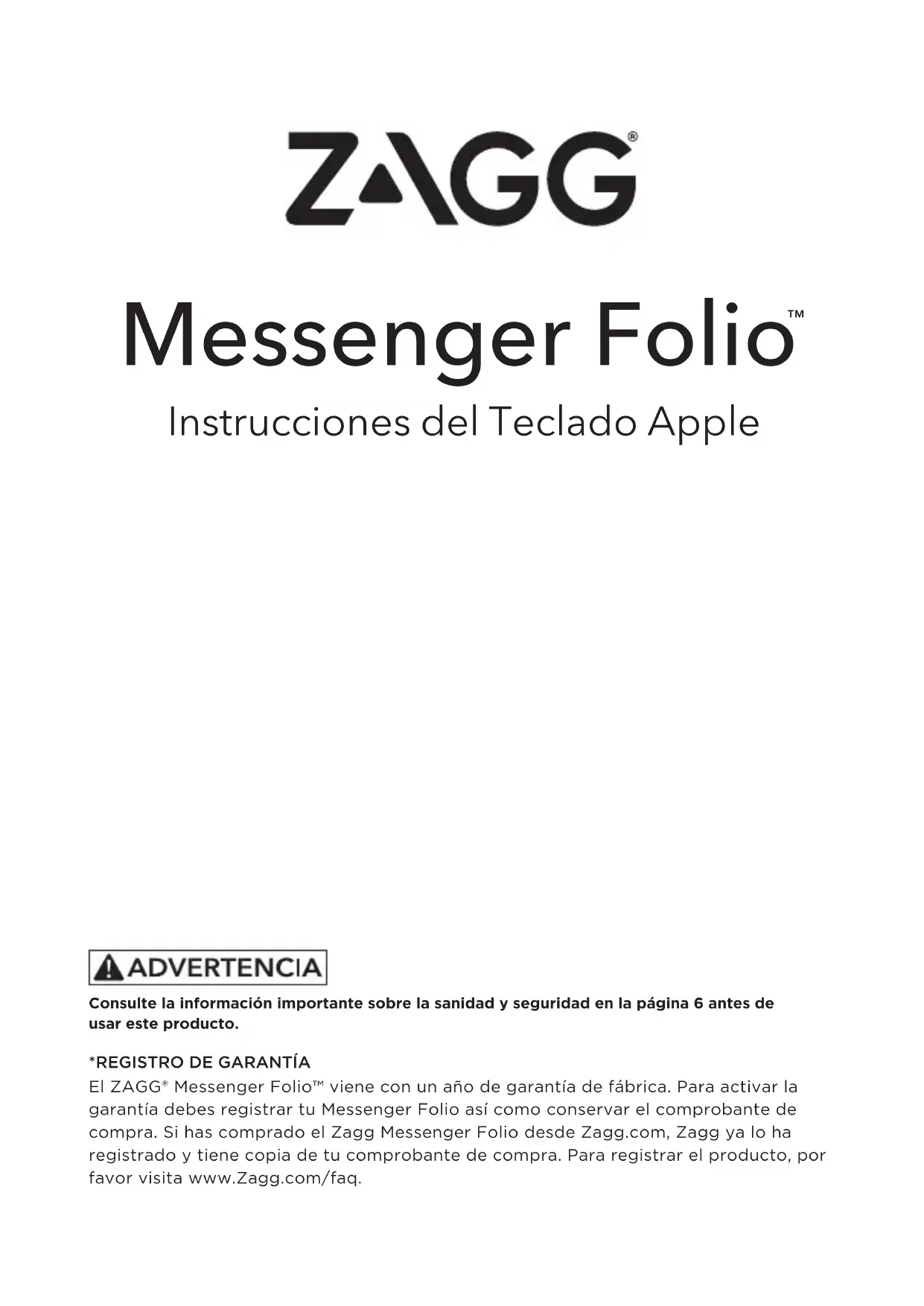 El ZAGG Messenger Folio™iene con un año de garantía de fabrica. Para activar la garantía debes registrar tu Messenger Folio asi como conservar el comprobante de compra. Si has comprado el Zagg Messenger Folio desde Zagg.com, Zagg ya lo ha registrado y tiene copia de tu comprobante de compra. Para registrar el producto, por favor visita www.Zagg.com/faq.