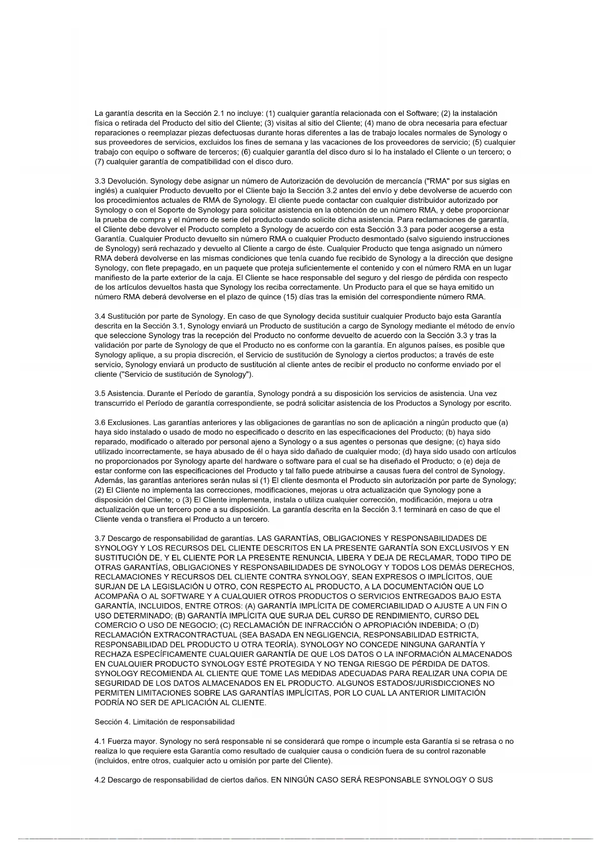 SYNOLOGY Y LOS RECURSOS DEL CLIENTE DESCRITOS EN LA PRESENTE GARANTÍA SON EXCLUSIVOS Y EN SUSTITUCIÓN DE, Y EL CLIENTE POR LA PRESENTE RENUNCIA, LIBERA Y DEJA DE RECLAMAR, TODO TIPO DE OTRAS GARANTÍAS, OBLIGACIONES Y RESPONSABILIDADES DE SYNOLOGY Y TODOS LOS DEMÁS DERECHOS, RECLAMACIONES Y RECURSOS DEL CLIENTE CONTRA SYNOLOGY, SEAN EXPRESOS O IMPLÍCITOS, QUE SURJAN DE LA LEGISLACIÓN U OTRO, CON RESPECTO AL PRODUCTO, A LA DOCUMENTACIÓN QUE LO ACOMPAÑA O AL SOFTWARE Y A CUALQUIER OTROS PRODUCTOS O SERVICIOS ENTREGADOS BAJO ESTA GARANTÍA, INCLUIDOS, ENTRE OTROS: (A) GARANTÍA IMPLÍCITA DE COMERCIABILIDAD O AJUSTE A UN FIN O USO DETERMINADO; (B) GARANTÍA IMPLÍCITA QUE SURJA DEL CURSO DE RENDIMIENTO, CURSO DEL COMERCIO O USO DE NEGOCIO; (C) RECLAMACIÓN DE INFRACCIÓN O APROPIACIÓN INDEBIDA; O (D) RECLAMACIÓN EXTRACONTRACTUAL (SEA BASADA EN NEGLIGENCIA, RESPONSABILIDAD ESTRICTA, RESPONSABILIDAD DEL PRODUCTO U OTRA TEORÍA). SYNOLOGY NO CONCEDE NINGUNA GARANTÍA Y RECHAZA ESPECÍFICAMENTE CUALQUIER GARANTÍA DE QUE LOS DATOS O LA INFORMACIÓN ALMACENADOS EN CUALQUIER PRODUCTO SYNOLOGY ESTÉ PROTEGIDA Y NO TENGA RIESGO DE PÉRDIDA DE DATOS. SYNOLOGY RECOMIENDA AL CLIENTE QUE TOME LAS MEDIDAS ADECUADAS PARA REALIZAR UNA COPIA DE SEGURIDAD DE LOS DATOS ALMACENADOS EN EL PRODUCTO. ALGUNOS ESTADOS/JURISDICCIONES NO PERMITEN LIMITACIONES SOBRE LAS GARANTÍAS IMPLÍCITAS, POR LO CUAL LA ANTERIOR LIMITACIÓN PODRÍA NO SER DE APLICACIÓN AL CLIENTE. Sección 4. Limitación de responsabilidad