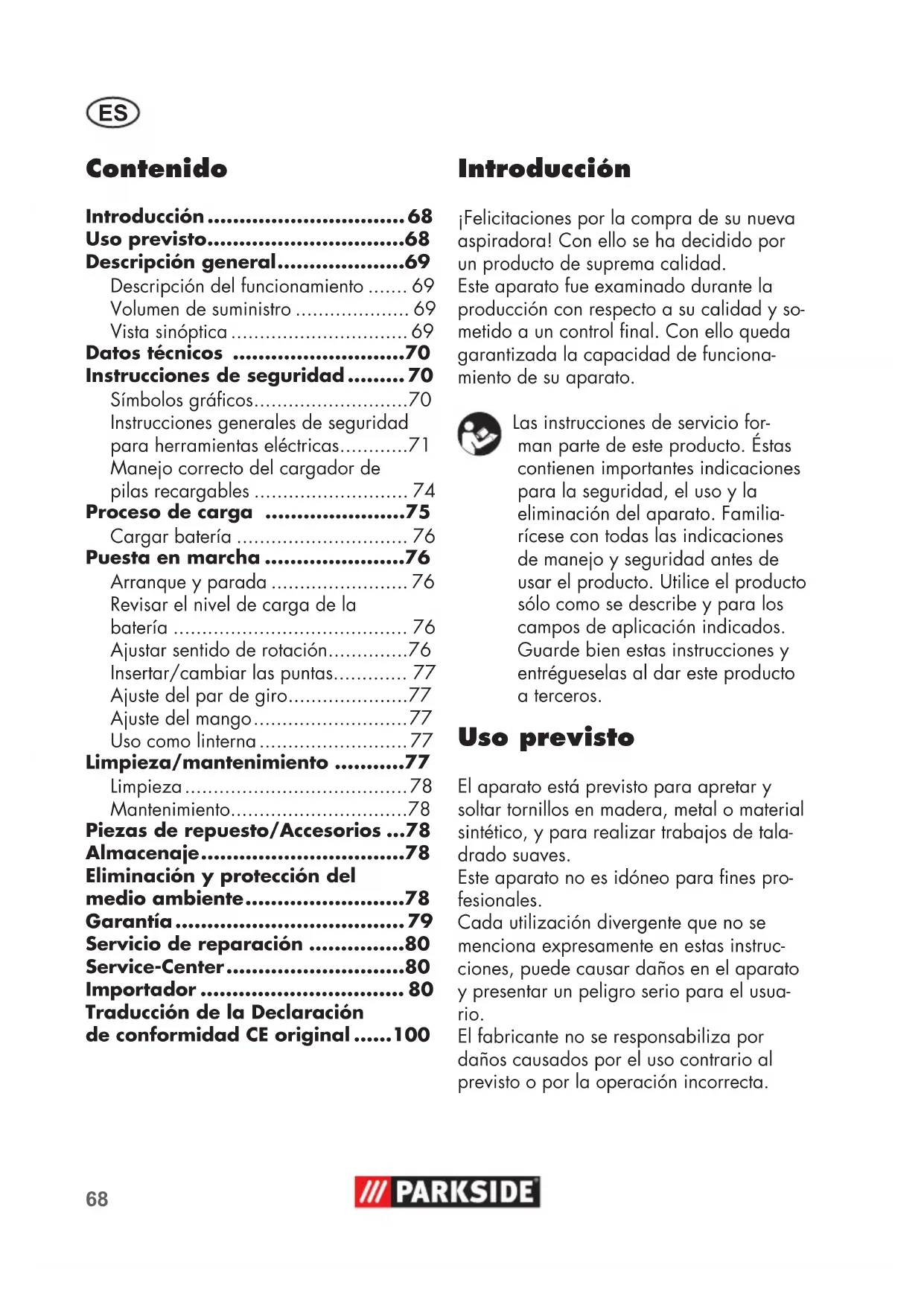 - Introducción ¡Felicitaciones por la compra de su nueva aspiradora! Con ello se ha decidido por un producto de suprema calidad. Este aparato fue examinado durante la producción con respecto a su calidad y so- metido a un control nal. Con ello queda garantizada la capacidad de funciona- miento de su aparato. Las instrucciones de servicio for- man parte de este producto. Éstas contienen importantes indicaciones para la seguridad, el uso y la eliminación del aparato. Familia- rícese con todas las indicaciones de manejo y seguridad antes de usar el producto. Utilice el producto sólo como se describe y para los campos de aplicación indicados. Guarde bien estas instrucciones y entrégueselas al dar este producto a terceros. Uso previsto El aparato está previsto para apretar y soltar tornillos en madera, metal o material sintético, y para realizar trabajos de tala- drado suaves. Este aparato no es idóneo para nes pro- fesionales. Cada utilización divergente que no se menciona expresamente en estas instruc- ciones, puede causar daños en el aparato y presentar un peligro serio para el usua- rio. El fabricante no se responsabiliza por daños causados por el uso contrario al previsto o por la operación incorrecta. Traducción de la Declaración de conformidad CE original p. 1006