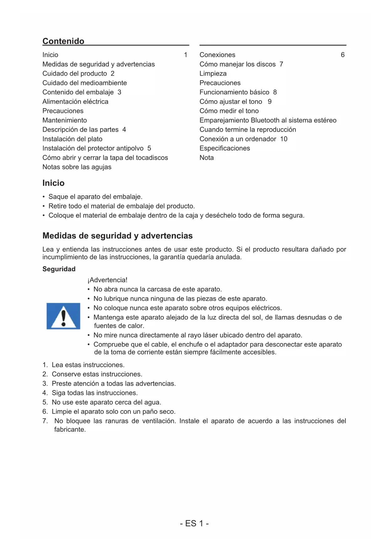 LE ROGAMOS QUE LEA ÍNTEGRAMENTE EL PRESENTE MANUAL DEL USUARIO ANTES DE UTILIZAR EL EQUIPO Y QUE CONSERVE ESTE FOLLETO PARA PODER CONSULTARLO EN EL FUTURO. ES- ES 1 - Contenido Inicio 1 Medidas de seguridad y advertencias Cuidado del producto 2 Cuidado del medioambiente Contenido del embalaje 3 Alimentación eléctrica Precauciones Mantenimiento Descripción de las partes 4 Instalación del plato Instalación del protector antipolvo 5 Cómo abrir y cerrar la tapa del tocadiscos Notas sobre las agujas Conexiones 6 Cómo manejar los discos 7 Limpieza Precauciones Funcionamiento básico 8 Cómo ajustar el tono 9 Cómo medir el tono Emparejamiento Bluetooth al sistema estéreo Cuando termine la reproducción Conexión a un ordenador 10 Especicaciones Nota Inicio
