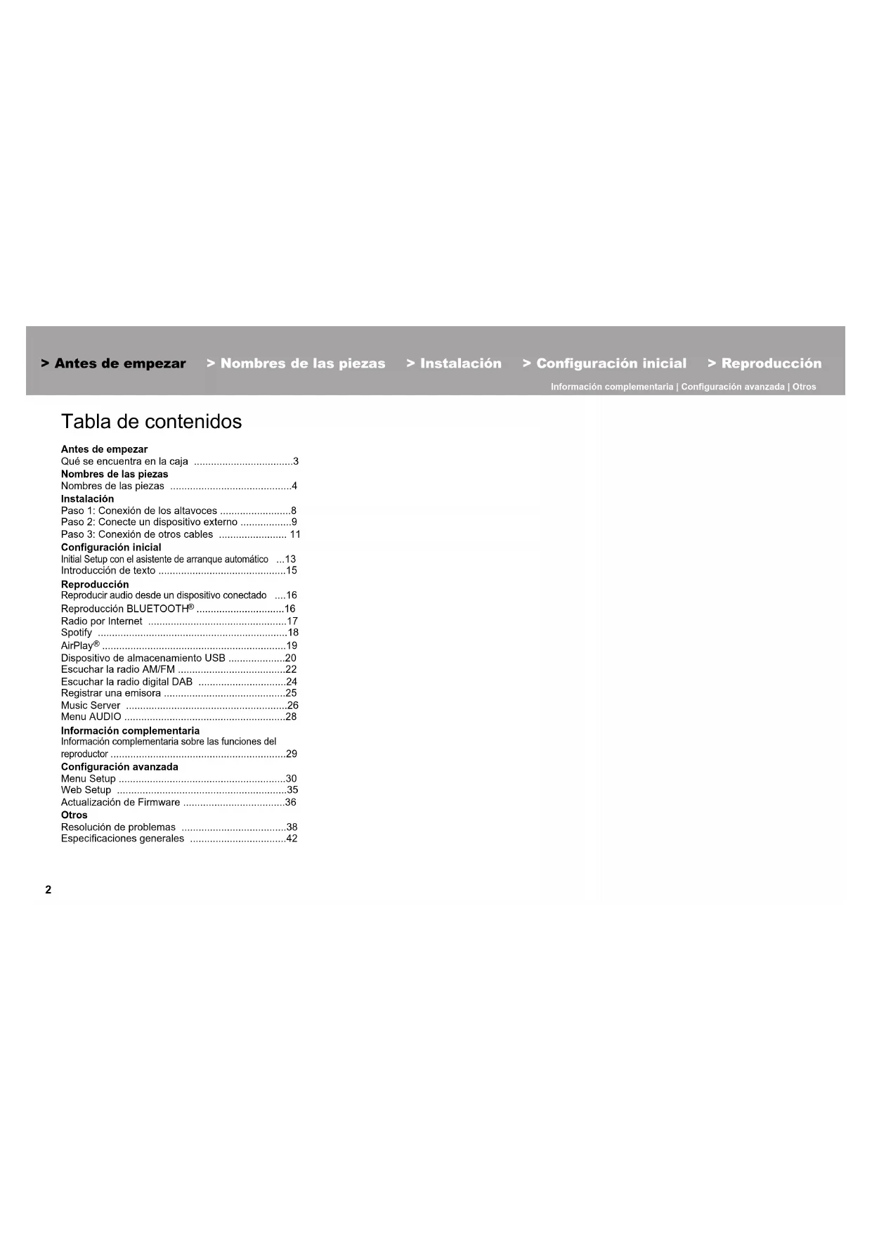 SN29403234A_TX-8250_Es.book 4 ページ 2017年10月17日 火曜日 午後1時36分5 > Antes de empezar > Nombres de las piezas > Instalación > Configuración inicial > Reproducción Información complementaria | Configuración avanzada | Otros