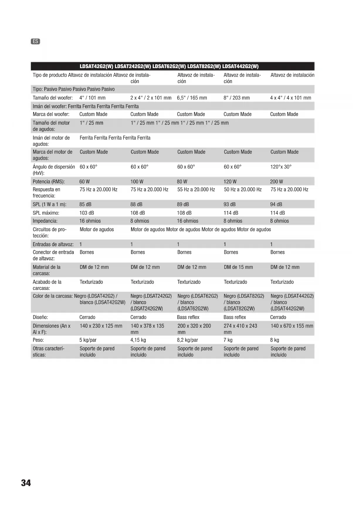 140x670x155 mm Peso: 5 kg/par 4,15 kg 8,2 kg/par 7 kg 8 kg Otras caracterí- sticas: Soporte de pared incluido Soporte de pared incluido Soporte de pared incluido Soporte de pared incluido Soporte de pared incluido ES35 LDSUB88 Tipo de producto: Subwoofer de instalación Tipo: Pasivo Tamaño del woofer: 2 x 8" / 2 x 203 mm Imán del woofer: Ferrita Marca del woofer: Custom Made Potencia (RMS): 200 (2x100)W Respuesta en frecuencia: 40 Hz a 120 Hz SPL (1 W a 1 m): 92 dB SPL máximo: 115 dB Impedancia: 2 x 8 ohmios Entradas de altavoz: 2 Conector de entrada de altavoz: Bornes Salidas de altavoz: 2 Conectores de salida de altavoz: Bornes Material de la carcasa: DM de 15 mm Acabado de la carcasa: Texturizado Color de la carcasa: Negro Diseño: Pasabanda Dimensiones (An x Al x F): 600 x 250 x 350 mm Peso: 13,3 kg Otras características: Filtro paso bajos interno (120 Hz) LDSAT62AG2(W) LDSAT82AG2(W) Tipo de producto: Altavoz de instalación Altavoz de instalación Tipo: Activo Activo Tamaño del woofer: 6,5" / 165 mm 8" / 203.2 mm Imán del woofer: Ferrita Ferrita Marca del woofer: Custom Made Custom Made Tamaño del motor de agudos: 1" / 25 mm 1" / 25 mm Imán del motor de agudos: Ferrita Ferrita Marca del motor de agudos: Custom Made Custom Made Amplificador: Clase AB Clase AB Ángulo de dispersión (HxV): 60 x 60° 60 x 60° Potencia (RMS): 50 W 80 W Respuesta en frecuencia: 55 Hz a 20.000 Hz 50 Hz a 20.000 Hz SPL máximo: 108 dB 114 dB Circuitos de protección: Motor de agudos, sobreintensidad Sobreintensidad, motor de agudos Controles: Interruptor de encendi- do/apagado, control de volumen, conmutador AUTO/ON Control de volumen, interruptor de encendido, selector Power Mode (On/Auto) Indicadores: Power Power, Limit Conectores de entrada de línea: Combo XLR/jack de 6,3 mm Jack de 6,3 mm, XLR Conectores de salida de línea: XLR XLR Alimentación eléctrica: Transformador Transformador Alimentación eléctrica: 220/240 VAC, 50/60 Hz 110 V AC – 120 V AC, 50 – 60 Hz (US)