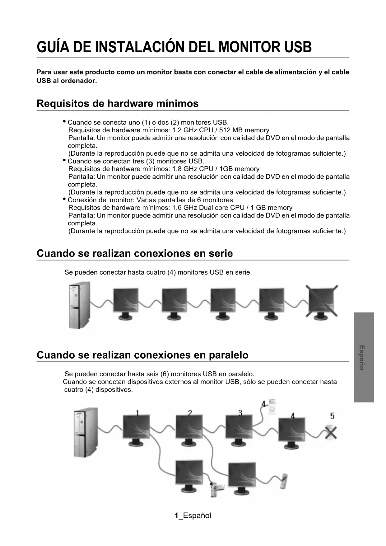 monitor en la bandeja del sistema, en la parte inferior de la pantalla del monitor. 2.Haga clic en el icono del monitor para ver la lista de los monitores USB conectados. Ejemplo) La figura siguiente muestra dos monitores USB conectados. 3.Seleccione el monitor para el que desea configurar la pantalla. Puede configurar los valores "Screen Resolution" , "Color Quality" y "Screen Rotation". USB_Monitor_install_guide.fm Page 4 Wednesday, October 10, 2007 1:50 PM5_Español Españo La configuración de la pantalla inicial después de instalar el programa Modo aplicable: Modo ampliado Posición del modo: A la derecha de la pantalla principal Giro del modo: 0° Monitor USB- Restricciones Sistemas operativos (OS) compatibles Windows XP - Service Pack 1 o anterior: Incompatible - Service Pack 2 o posterior: Compatible Windows 2000 - Service Pack 3 o anterior: Incompatible - Service Pack 4 o posterior: Compatible Windows Server 2003 - Incompatible Windows Vista - Compatible (64 bits no se admite) - Para comprobar la información del sistema operativo del ordenador, haga clic con el botón derecho en “Mi PC” en el “escritorio de Windows” y seleccione “Propiedades” en el menú que se muestra. Compuebe la información en la pestaña “General” de la ventana “Propiedades del ordenador”. Dado que al monitor USB se le reconoce como un dispositivo USB, la pantalla DOS que aparece en los monitores normales cuando arranca el PC no se muestra. - Si se desea usar el monitor USB como monitor principal, se debe conectar un cable D-Sub (para las señales analógicas) o un cable DVI (para las señales digitales). No se puede usar el monitor USB con el software mediante la aceleración de hardware 3D. - Real Player (El modo de expansión no se admite.) - Con la mayoría de juegos 3D - Ejecución de programas con Direct X Programas de películas admitidos - Power DVD - Win DVD(Versión 5 o posterior.) - VLC Este monitor no admite el programa MagicTune. - La función MagicRotation puede que no funcione normalmente. - Si el programa MagicTune está instalado en el PC, puede que no sea compatible con el monitor. El monitor USB no admite la función de giro automática. - La función puede que no se admita en algunos modelos. Si desea obtener más información, consulte el manual del usuario. El monitor USB se enciende automáticamente en cuanto se conecta el cable de alimentación. - La función puede que no se admita en algunos modelos. El monitor USB puede que no funcione normalmente con USB 1.0. Si se conectan varios monitores USB, aparece una pantalla vacía mientras el PC los reconoce. Las pantallas se muestran en los monitores USB una vez el PC los ha reconocido. USB_Monitor_install_guide.fm Page 5 Wednesday, October 10, 2007 1:50 PM6_Español Españo Si la tarjeta gráfica del PC no admite WDDM, es posible que el modo ampliado no esté disponible en Windows Vista. Ejemplo) Algunas versiones de Matrox Card Cuando instale el controlador del monitor USB, asegúrese de que el Primary Monitor existente esté situado a la izquierda como (Monitor 1) y a continuación instale el controlador. Lista de chequeo Antes de llamar a un centro de servicio, revise la información proporcionada en esta sección para ver si puede resolver el problema usted mismo. Si necesita ayuda, llame por teléfono al número que figura en el documento de garantía, al número de la sección informaciones o contáctese con el vendedor autorizado. En la pantalla no aparece ninguna imagen. No puedo encender el monitor. Si se apaga y se enciende el monitor USB rápida y repetidamente, puede no funcionar adecuadamente. El PC reconoce al monitor USB como un dispositivo USB general. Por lo tanto, consulte la información para la solución de errores de los dispositivos USB en la página web del cliente de Microsoft. - Haga clic con el botón derecho del ratón en 'My Computer'(Mi PC) y haga clic en 'Properties'(Propiedades). - Se muestra el Administrador de dispositivos. - En el menú 'Acción', haga clic en 'Buscar cambios de hardware'. - Si el problema persiste, debe reiniciar el ordenador. La pantalla del monitor USB se bloquea. Compruebe la configuración de 'Aceleración de hardware' del monitor USB en la ventana 'Propiedades de pantalla'. Configure el valor 'Aceleración de hardware' como 'Lleno'. - Haga clic con el botón derecho en el escritorio de Windows y haga clic en 'Propiedades'. - Aparece la ventana 'Propiedades de pantalla'.Seleccione la pestaña 'Configuración' y haga clic en 'Avanzado'. - Cuando se muestre la ventana 'Propiedades' del monitor seleccione la pestaña 'Solucionar problemas'.Mueva el deslizador “Aceleración de hardware” hasta “Lleno” Mi ordenador está encendido y el LED parpadea. Sin embargo, sólo se ve una pantalla vacía en el monitor. Compruebe si el cable USB está conectado correctamente. Vuelva a conectar el cable USB. Mi monitor USB está conectado pero la pantalla está en blanco. ¿Se ejecuta el programa de instalación automática cuando el monitor USB está conectado? Compruebe su cuenta de usuario en el panel de control. - Haga clic en Inicio – Panel de control – Cuenta del usuario - Cambiar una cuenta – Administrador: Administra dor de equipo – Cambiar mi tipo de cuenta. En la ventana que se muestra, Administrador de equipo (usuario privilegiado o superior) debe estar seleccionado. – En ordenadores con Windows XP. - Configure su tipo de cuenta como se indica más arriba. - A continuación apague y encienda el botón de alimentación de la parte frontal del monitor USB o vuelva a conectar el cable USB conectado al monitor. - Si el problema persiste, instale el "Controlador de instalación del monitor USB" desde el CD suministrado. - Si desea más información consulte la sección Manual de instalación. - Una vez completada la instalación, reinicie el PC. USB_Monitor_install_guide.fm Page 6 Wednesday, October 10, 2007 1:50 PM7_Español Españo Q & A ¿Cómo puedo c