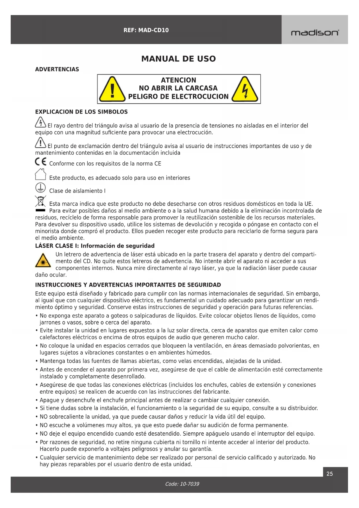 El rayo dentro del triángulo avisa al usuario de la presencia de tensiones no aisladas en el interior del equipo con una magnitud suciente para provocar una electrocución. El punto de exclamación dentro del triángulo avisa al usuario de instrucciones importantes de uso y de mantenimiento contenidas en la documentación incluida Conforme con los requisitos de la norma CE Este producto, es adecuado solo para uso en interiores Clase de aislamiento I Esta marca indica que este producto no debe desecharse con otros residuos domésticos en toda la UE. Para evitar posibles daños al medio ambiente o a la salud humana debido a la eliminación incontrolada de residuos, recíclelo de forma responsable para promover la reutilización sostenible de los recursos materiales. Para devolver su dispositivo usado, utilice los sistemas de devolución y recogida o póngase en contacto con el minorista donde compró el producto. Ellos pueden recoger este producto para reciclarlo de forma segura para el medio ambiente. LÁSER CLASE I: Información de seguridad Un letrero de advertencia de láser está ubicado en la parte trasera del aparato y dentro del comparti- mento del CD. No quite estos letreros de advertencia. No intente abrir el aparato ni acceder a sus componentes internos. Nunca mire directamente al rayo láser, ya que la radiación láser puede causar daño ocular.