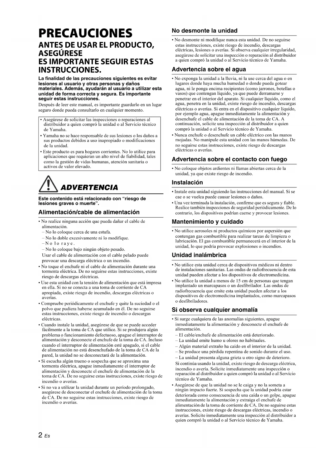 - No desmonte ni modifique nunca esta unidad. De no seguirse estas instrucciones, existe riesgo de incendio, descargas eléctricas, lesiones o averías. Si observa cualquier irregularidad, asegúrese de solicitar una inspección o reparación al distribuidor a quien compró la unidad o al Servicio técnico de Yamaha. Advertencia sobre el agua
