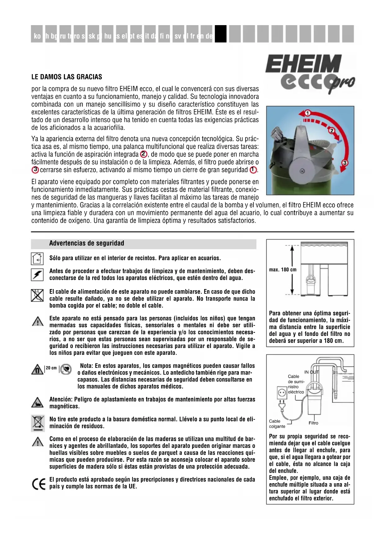 por la compra de su nuevo filtro EHEIM ecco, el cual le convencerá con sus diversas ventajas en cuanto a su funcionamiento, manejo y calidad. Su tecnologia innovadora combinada con un manejo sencillísimo y su diseño característico constituyen las excelentes características de la última generación de filtros EHEIM. Éste es el resul- tado de un desarrollo intenso que ha tenido en cuenta todas las exigencias prácticas de los aficionados a la acuariofilia. Ya la apariencia externa del filtro denota una nueva concepción tecnológica. Su prác- tica asa es, al mismo tiempo, una palanca multifuncional que realiza diversas tareas: activa la función de aspiración integrada , de modo que se puede poner en marcha fácilmente después de su instalación o de la limpieza. Además, el filtro puede abrirse o cerrarse sin esfuerzo, activando al mismo tiempo un cierre de gran seguridad . El aparato viene equipado por completo con materiales filtrantes y puede ponerse en funcionamiento inmediatamente. Sus prácticas cestas de material filtrante, conexio- nes de seguridad de las mangueras y llaves facilitan al máximo las tareas de manejo y mantenimiento. Gracias a la correlación existente entre el caudal de la bomba y el volumen, el filtro EHEIM ecco ofrece una limpieza fiable y duradera con un movimiento permanente del agua del acuario, lo cual contribuye a aumentar su contenido de oxígeno. Una garantía de limpieza óptima y resultados satisfactorios.