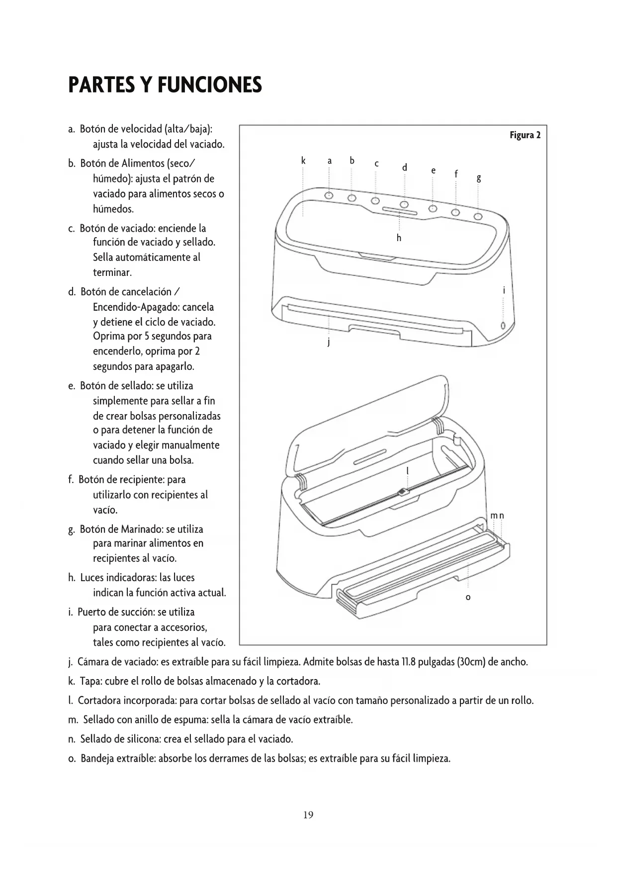 m n j. Cámara de vaciado: es extraíble para su fácil limpieza. Admite bolsas de hasta 11.8 pulgadas (30cm) de ancho. k. Tapa: cubre el rollo de bolsas almacenado y la cortadora. l. Cortadora incorporada: para cortar bolsas de sellado al vacío con tamaño personalizado a partir de un rollo. m. Sellado con anillo de espuma: sella la cámara de vacío extraíble. n. Sellado de silicona: crea el sellado para el vaciado. o. Bandeja extraíble: absorbe los derrames de las bolsas; es extraíble para su fácil limpieza.20