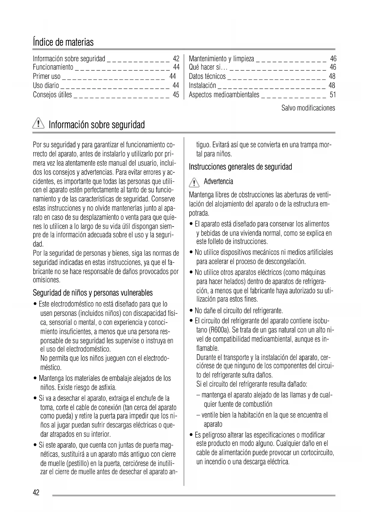 - Si este aparato, que cuenta con juntas de puerta mag- néticas, sustituirá a un aparato más antiguo con cierre de muelle (pestillo) en la puerta, cerciórese de inutili- zar el cierre de muelle antes de desechar el aparato an- tiguo. Evitará así que se convierta en una trampa mor- tal para niños. Instrucciones generales de seguridad Advertencia Mantenga libres de obstrucciones las aberturas de venti- lación del alojamiento del aparato o de la estructura em- potrada.