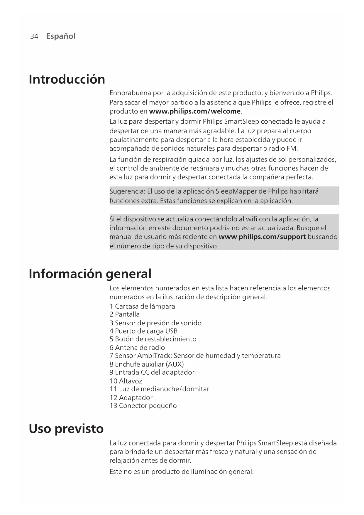 Introducción Enhorabuena por la adquisición de este producto, y bienvenido a Philips. Para sacar el mayor partido a la asistencia que Philips le ofrece, registre el producto en www.philips.com/welcome. La luz para despertar y dormir Philips SmartSleep conectada le ayuda a despertar de una manera más agradable. La luz prepara al cuerpo paulatinamente para despertar a la hora establecida y puede ir acompañada de sonidos naturales para despertar o radio FM. La función de respiración guiada por luz, los ajustes de sol personalizados, el control de ambiente de recámara y muchas otras funciones hacen de esta luz para dormir y despertar conectada la compañera perfecta. Sugerencia: El uso de la aplicación SleepMapper de Philips habilitará funciones extra. Estas funciones se explican en la aplicación. Si el dispositivo se actualiza conectándolo al wifi con la aplicación, la información en este documento podría no estar actualizada. Busque el manual de usuario más reciente en www.philips.com/support buscando el número de tipo de su dispositivo. Información general Los elementos numerados en esta lista hacen referencia a los elementos numerados en la ilustración de descripción general. 1 Carcasa de lámpara 2 Pantalla 3 Sensor de presión de sonido 4 Puerto de carga USB 5 Botón de restablecimiento 6 Antena de radio 7 Sensor AmbiTrack: Sensor de humedad y temperatura 8 Enchufe auxiliar (AUX) 9 Entrada CC del adaptador 10 Altavoz 11 Luz de medianoche/dormitar 12 Adaptador 13 Conector pequeño Uso previsto La luz conectada para dormir y despertar Philips SmartSleep está diseñada para brindarle un despertar más fresco y natural y una sensación de relajación antes de dormir. Este no es un producto de iluminación general.35 Español Los efectos de la luz de despertar y dormir conectada La luz para despertar y dormir Philips SmartSleep prepara el cuerpo de forma paulatina para que se despierte durante los últimos 30minutos de sueño. En las primeras horas de la mañana los ojos están más sensibles a la luz que cuando estamos despiertos. Durante ese periodo los niveles relativamente bajos de luz del amanecer natural simulado preparan al cuerpo para despertar y estar alerta. Las personas que usan el dispositivo se levantan con mayor facilidad, tienen un mejor humor en general en la mañana y se sienten con más energía. Ya que la sensibilidad a la luz varía de persona a persona, puede establecer la intensidad del dispositivo a un nivel que coincida con su sensibilidad a la luz para comenzar el día de la mejor manera. Para experimentar plenamente los efectos de la luz conectada para despertar y dormir, coloque el dispositivo aproximadamente a 16 – 20 pulgadas / 40 – 50 cm de su cabeza, sobre una superficie plana y estable de su buró. Para obtener más información acerca de la luz para dormir y despertar conectada, consulte www.philips.com. Íconos de menú interactivo Perfil despertador/Alarma Intensidad de la luz y apagado/encendido de la luz. Volver a un nivel superior en el menú Configuración Sonidos Confirmar y guardar la configuración Programas de relajación Enchufe AUX Radio Habilitar wifi Deshabilitar wifi Cambiar la configuración de la alarma Configuración y brillo de la pantalla Seleccionar un sonido natural Descartar alarma Habilitar el tiempo de espera de la pantalla Deshabilitar el tiempo de espera de la pantalla Desactivar la alarma Habilitar comentarios de audio Deshabilitar comentarios de audio Guía de luz o sonido Simulación del atardecer Duración del perfil despertador Borrar perfil despertador36 Español Días de la semana RelaxBreathe Ritmo de RelaxBreathe Seleccionar día de la semana Anular la selección del día de la semana Duración de un programa Iniciar hora de dormir Iniciar el programa Detener el programa Conectar su dispositivo a la red Wi-Fi Si el dispositivo se actualiza conectándolo al wifi con la aplicación, la información en este documento podría no estar actualizada. Busque el manual de usuario más reciente en www.philips.com/support. Philips se reserva el derecho de actualizar el firmware de la aplicación. Configuración fácil de wifi Descargue la aplicación SleepMapper de Philips desde Google Play o desde la App Store en su teléfono celular. Consulte la información en Google Play o en la App Store para comprobar si su teléfono celular es compatible con la aplicación. Puede configurar fácilmente la conexión wifi para su luz para dormir y despertar conectada. La configuración para instalar la luz para dormir y despertar y conectarla a la red de wifi de su hogar solo necesita realizarse una sola vez. Esta configuración le tomará aproximadamente de 5 a 10 minutos. El asistente de configuración de la luz de despertar y dormir conectada 1 Cuando utilice la luz de despertar y dormir conectada por primera vez, un asistente de configuración enciende el dispositivo. 2 Después de seleccionar su idioma en la pantalla del dispositivo, continúe en la aplicación. Asegúrese de que tiene la aplicación abierta en su teléfono celular. 3 Siga las instrucciones en la aplicación para conectar su dispositivo a la red de wifi. Si tiene problemas para conectar su dispositivo, compruebe la sección de asistencia en la aplicación o los artículos mencionados en la sección de solución de problemas en este manual de usuario (ver 'Solución de problemas').