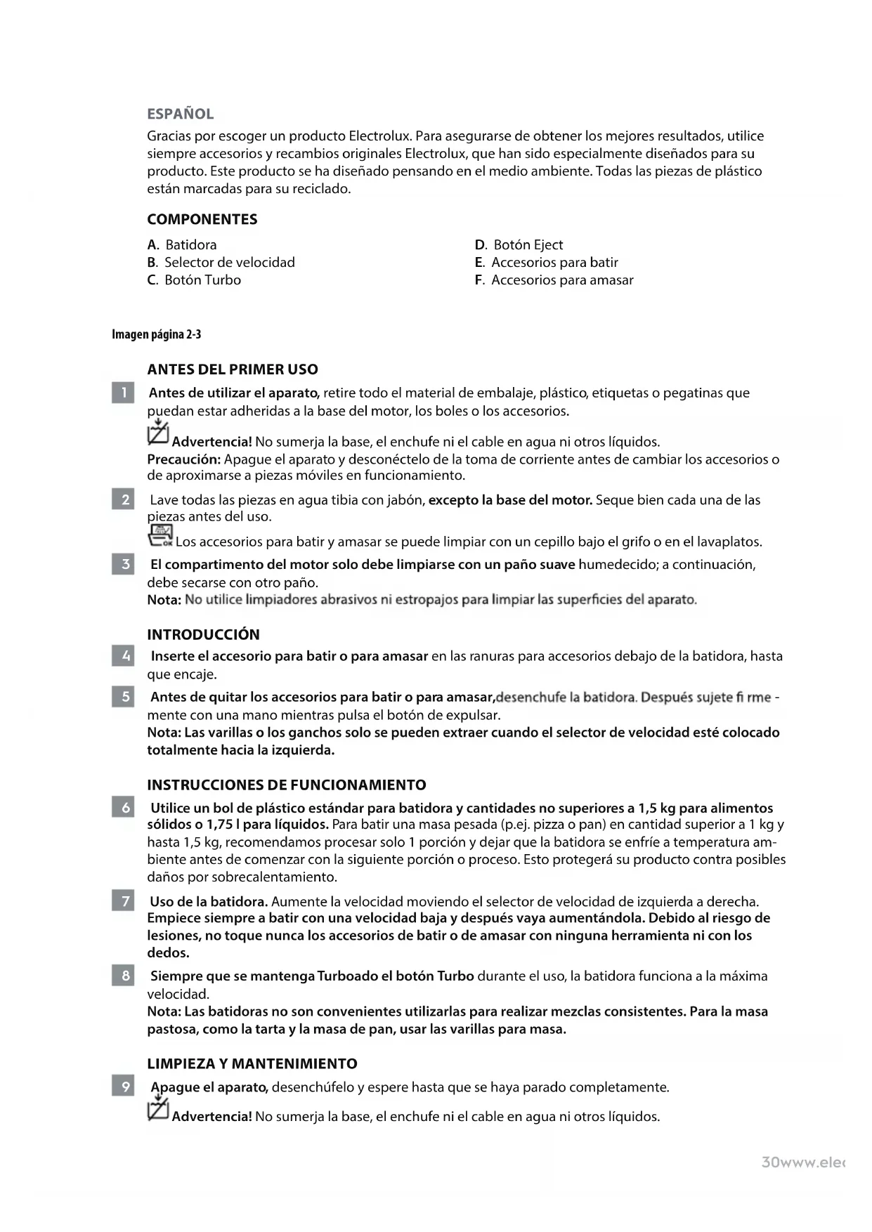 10 Lave todas las piezas en agua tibia con jabón, excepto la base del motor. Seque bien cada una de las piezas antes del uso. Los accesorios para batir y amasar se puede limpiar con un cepillo bajo el grifo o en el lavaplatos. 11 El compartimento del motor solo debe limpiarse con un paño suave humedecido; a continuación, debe secarse con otro paño. Nota: Antes de guardar, quite el enchufe de la toma de corriente. Asegúrese de que el aparato está limpio y totalmente seco. ¡Disfrute de su nuevo producto Electrolux!