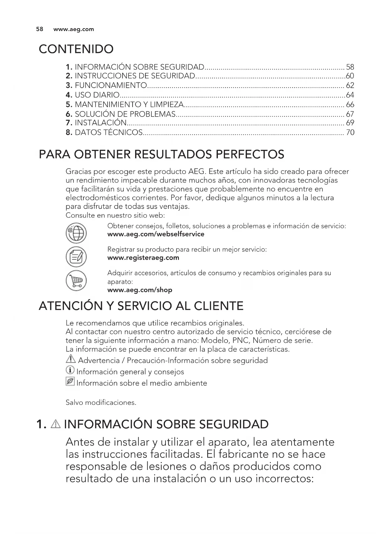 Antes de instalar y utilizar el aparato, lea atentamente las instrucciones facilitadas. El fabricante no se hace responsable de lesiones o daños producidos como resultado de una instalación o un uso incorrectos: www.aeg.com 58Conserve siempre estas instrucciones en lugar seguro y accesible para futuras consultas.