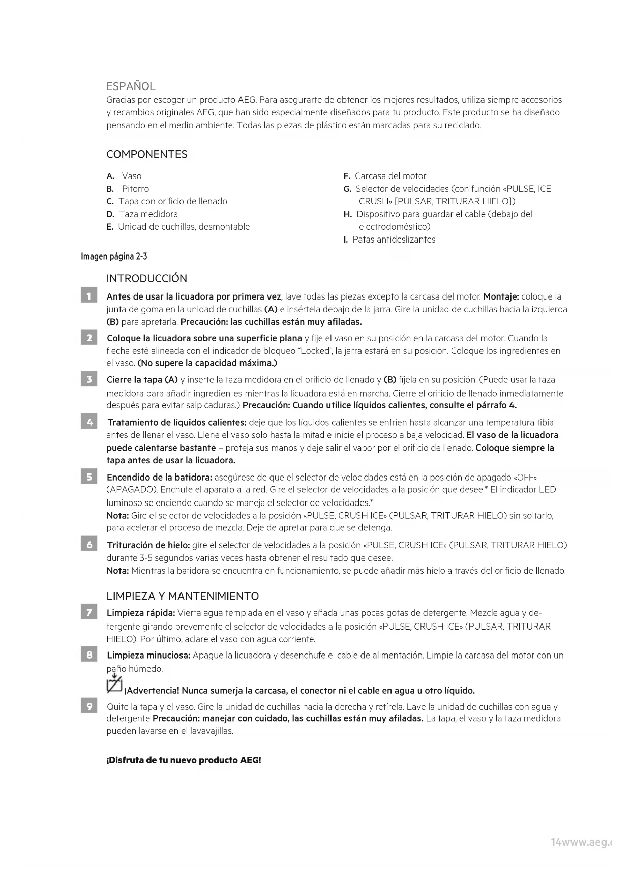 7 Limpieza rápida: Vierta agua templada en el vaso y añada unas pocas gotas de detergente. Mezcle agua y de- tergente girando brevemente el selector de velocidades a la posición «PULSE, CRUSH ICE» (PULSAR, TRITURAR HIELO). Por último, aclare el vaso con agua corriente. 8 Limpieza minuciosa: Apague la licuadora y desenchufe el cable de alimentación. Limpie la carcasa del motor con un paño húmedo. ¡Advertencia! Nunca sumerja la carcasa, el conector ni el cable en agua u otro líquido. 9 Quite la tapa y el vaso. Gire la unidad de cuchillas hacia la derecha y retírela. Lave la unidad de cuchillas con agua y detergente Precaución: manejar con cuidado, las cuchillas están muy aladas. La tapa, el vaso y la taza medidora pueden lavarse en el lavavajillas. ¡Disfruta de tu nuevo producto AEG!15www.aeg.com