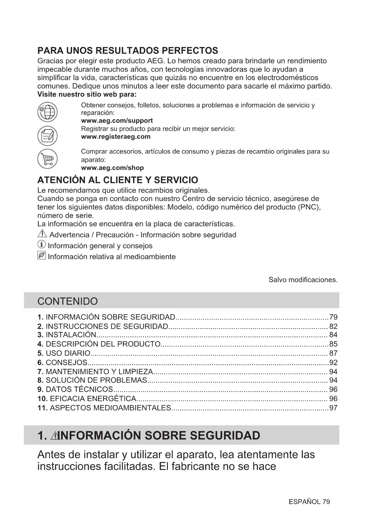 Gracias por elegir este producto AEG. Lo hemos creado para brindarle un rendimiento impecable durante muchos años, con tecnologías innovadoras que lo ayudan a simplificar la vida, características que quizás no encuentre en los electrodomésticos comunes. Dedique unos minutos a leer este documento para sacarle el máximo partido. Visite nuestro sitio web para:Obtener consejos, folletos, soluciones a problemas e información de servicio yreparación:www.aeg.com/supportRegistrar su producto para recibir un mejor servicio:www.registeraeg.comComprar accesorios, artículos de consumo y piezas de recambio originales para suaparato:www.aeg.com/shop