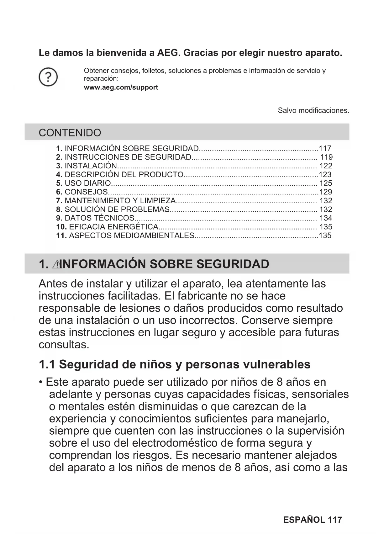 Recicle los materiales con el símbolo . Coloque el material de embalaje en los contenedores adecuados para su reciclaje. Ayude a proteger el medio ambiente y la salud pública, así como a reciclar residuos de aparatos eléctricos y electrónicos. No deseche los aparatos marcados con el ESPAÑOL 135símbolo junto con los residuos domésticos. Lleve el producto a su centro de reciclaje local o póngase en contacto con su oficina municipal. 136 ESPAÑOLVälkommen till AEG! Tack för att du har valt en av våra produkter. Få tips om användning, broschyrer, felsökning, service- och reparationsinformation:www.aeg.com/supportMed reservation för ändringar. INNEHÅLL