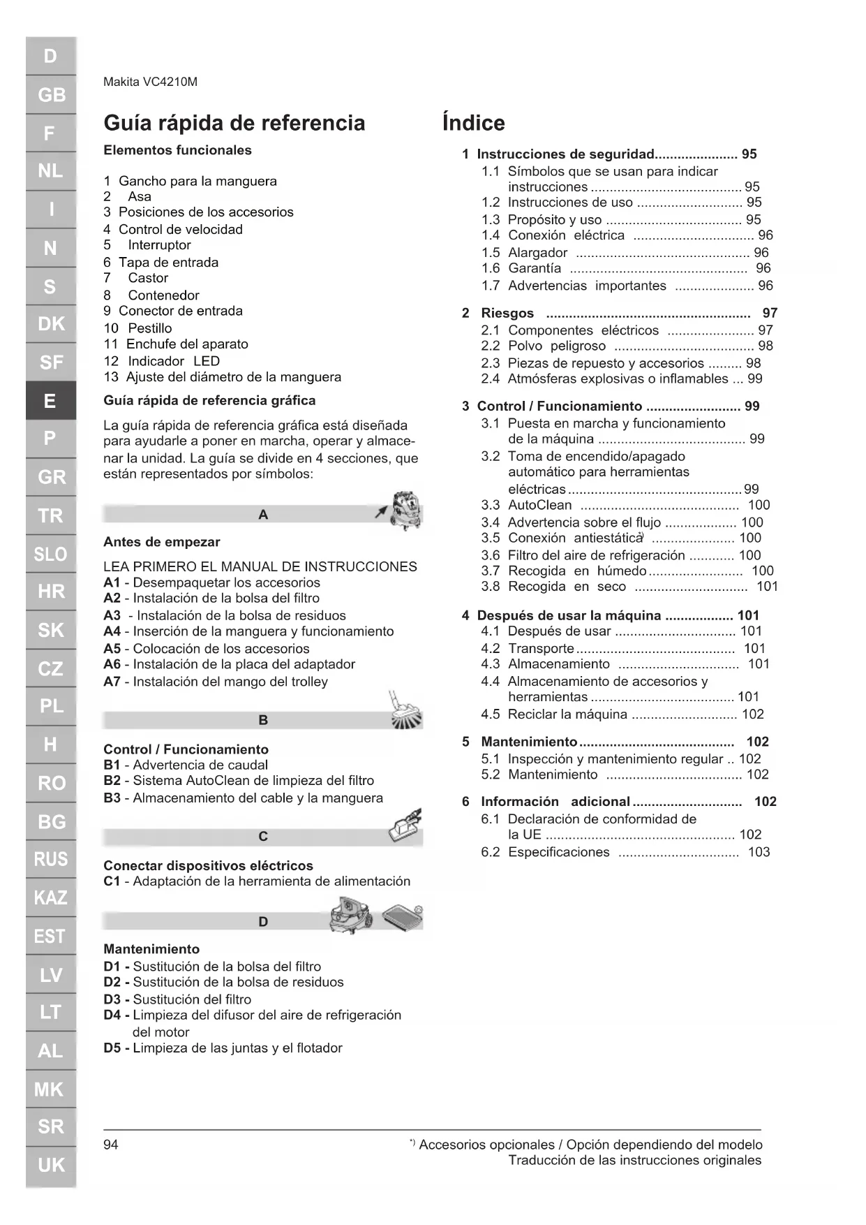 Mantenimiento D1 - Sustitución de la bolsa del filtro D2 - Sustitución de la bolsa de residuos D3 - Sustitución del filtro D4 - Limpieza del difusor del aire de refrigeración del motor D5 - Limpieza de las juntas y el flotador Índice 1 Instrucciones de seguridad...................... 95
