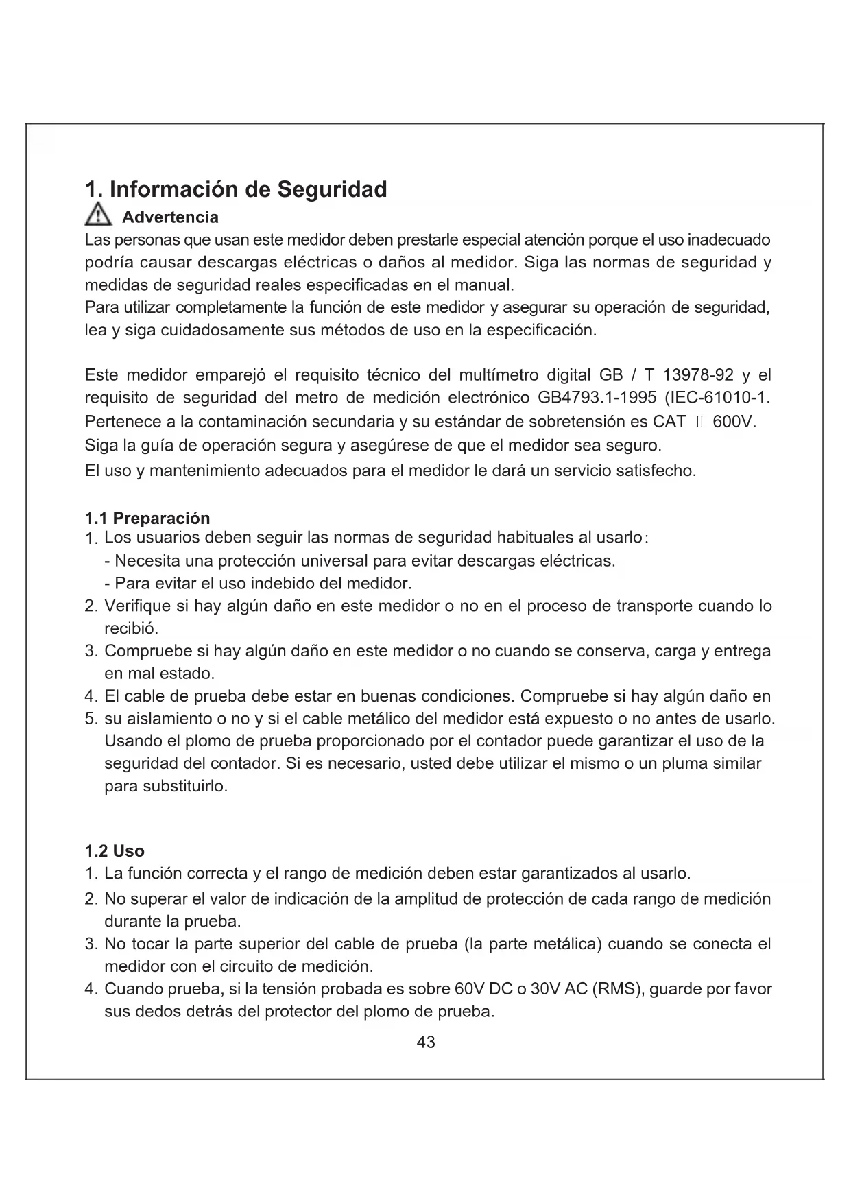 Advertencia Las personas que usan este medidor deben prestarle especial atención porque el uso inadecuado podría causar descargas eléctricas o daños al medidor. Siga las normas de seguridad y medidas de seguridad reales especificadas en el manual. Para utilizar completamente la función de este medidor y asegurar su operación de seguridad, lea y siga cuidadosamente sus métodos de uso en la especificación. Este medidor emparejó el requisito técnico del multímetro digital GB / T 13978-92 y el requisito de seguridad del metro de medición electrónico GB4793.1-1995 (IEC-61010-1. Pertenece a la contaminación secundaria y su estándar de sobretensión es CAT Ⅱ 600V. Siga la guía de operación segura y asegúrese de que el medidor sea seguro. El uso y mantenimiento adecuados para el medidor le dará un servicio satisfecho.
