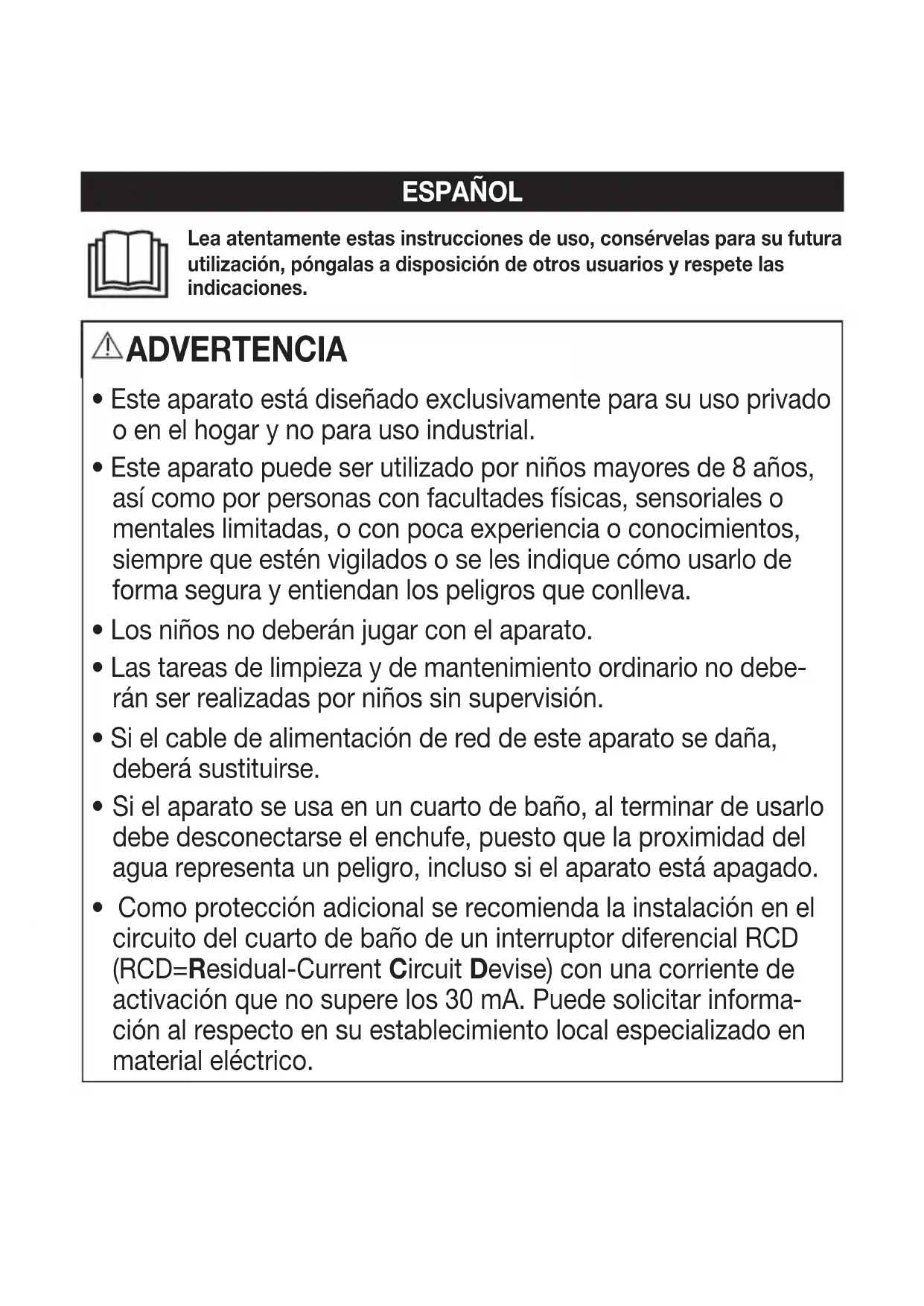- No utilise ningún cable de extension en el cuarto de bazo, para poder alcantar rápido el enchufe en caso de urgencia.