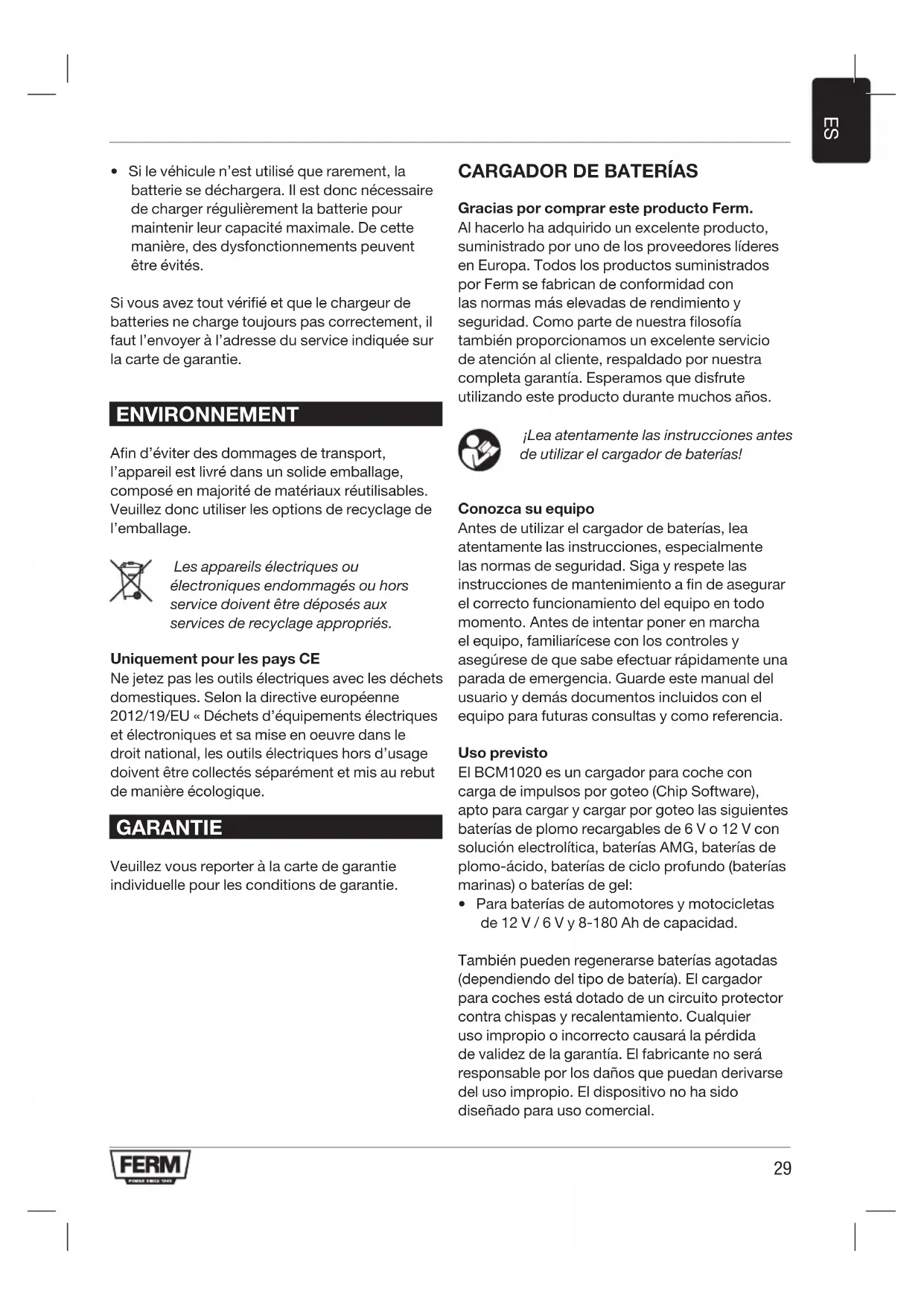 Antes de utiliser el cargador de baterías, lea atentamente las instrucciones, especially las normas de seguridad. Siga y respete las instrucciones de mantenimiento a fin de asegurar el correcto funciona del equipo en todo momento. Antes de intentar poder en marcha el equipo, familiarícese con los controlles y asegúrese de que saber efectuar rápidamente una parada deemergency. Guarde este manual del usuario yDEMás documents incluidos con el equipo para futuras consultas y como referencia.