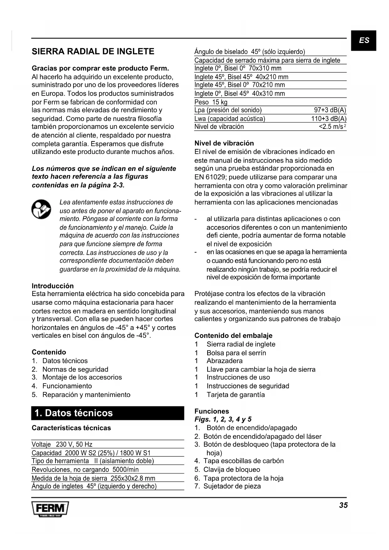 Gracias por comprar este producto Ferm. Al hacerlo ha adquirido un excelente producto, suministrado por uno de los proveedores líderes en Europa. Todos los productos suministrados por Ferm se fabrican de conformidad con las normas más elevadas de rendimiento y seguridad. Como parte de nuestra filosofía también proporcionamos un excelente servicio de atención al cliente, respaldado por nuestra completa garantía. Esperamos que disfrute utilizando este producto durante muchos años. Los números que se indican en el siguiente texto hacen referencia a las figuras contenidas en la página 2-3. Lea atentamente estas instrucciones de uso antes de poner el aparato en funciona- miento. Póngase al corriente con la forma de funcionamiento y el manejo. Cuide la máquina de acuerdo con las instrucciones para que funcione siempre de forma correcta. Las instrucciones de uso y la correspondiente documentación deben guardarse en la proximidad de la máquina. Introducción Esta herramienta eléctrica ha sido concebida para usarse como máquina estacionaria para hacer cortes rectos en madera en sentido longitudinal y transversal. Con ella se pueden hacer cortes horizontales en ángulos de -45° a +45° y cortes verticales en bisel con ángulos de -45°. Contenido