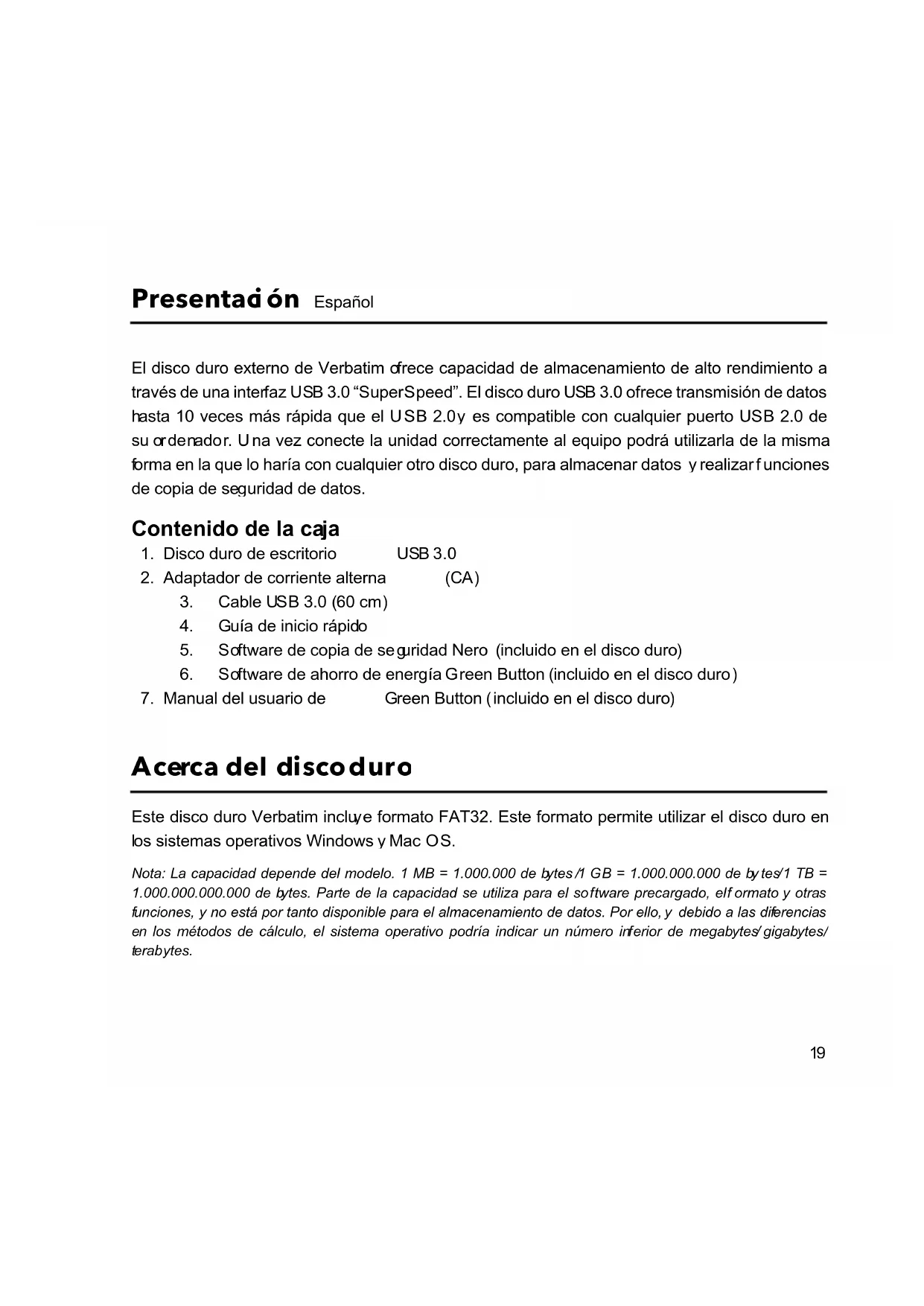 Descarga las instrucciones para tu Disco duro externo en formato PDF gratis! Encuentra tus instrucciones Store 'n' Save - VERBATIM y toma tu dispositivo electrónico nuevamente en la mano. En esta página están publicados todos los documentos necesarios para el uso de su dispositivo. Store 'n' Save de la marca VERBATIM.