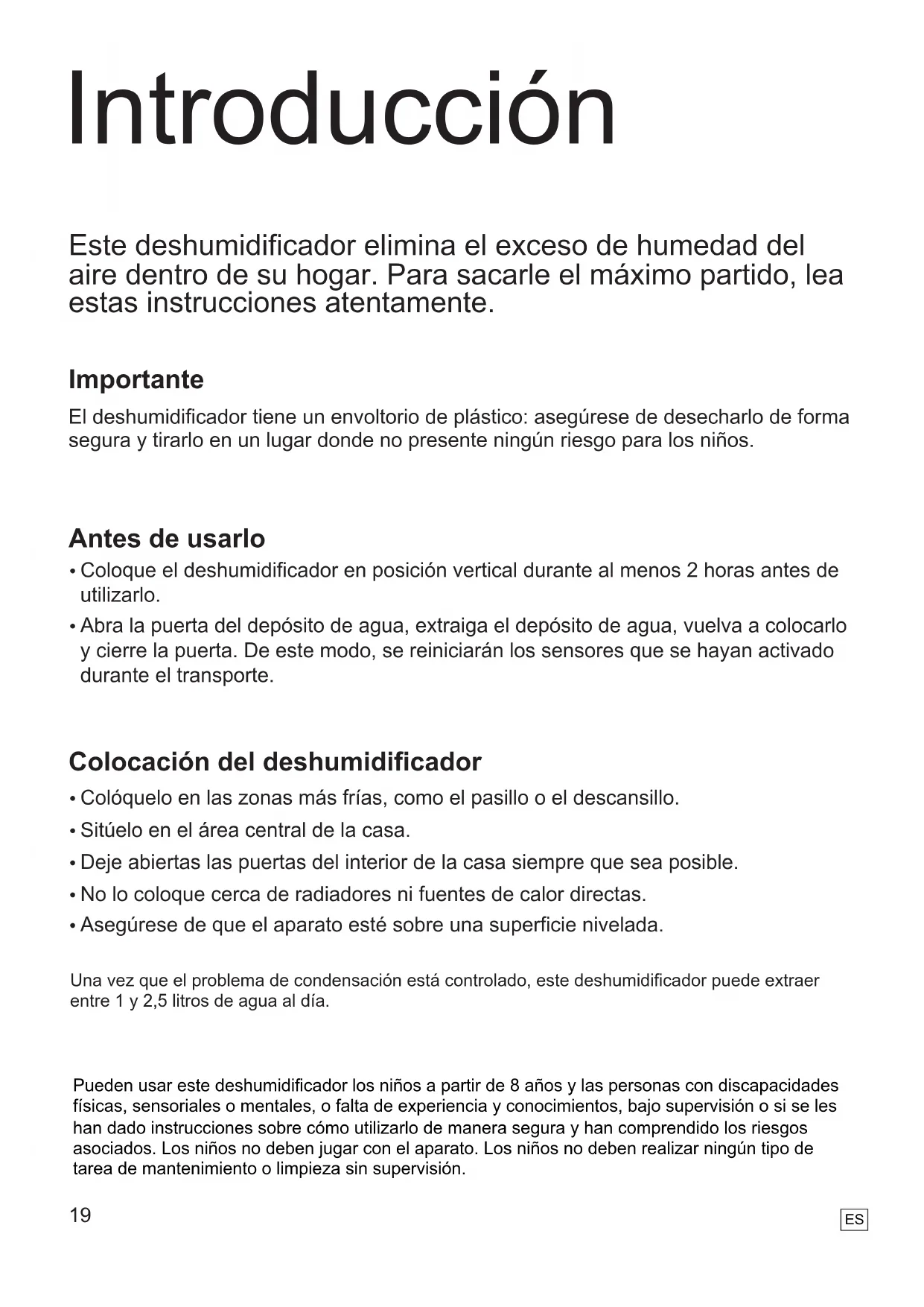- Asegúrese de que el aparato esté sobre una superficie nivelada. Introducción Una vez que el problema de condensación está controlado, este deshumidificador puede extraer entre 1 y 2,5 litros de agua al día. Pueden usar este deshumidificador los niños a partir de 8 años y las personas con discapacidades físicas, sensoriales o mentales, o falta de experiencia y conocimientos, bajo supervisión o si se les han dado instrucciones sobre cómo utilizarlo de manera segura y han comprendido los riesgos asociados. Los niños no deben jugar con el aparato. Los niños no deben realizar ningún tipo de tarea de mantenimiento o limpieza sin supervisión.
