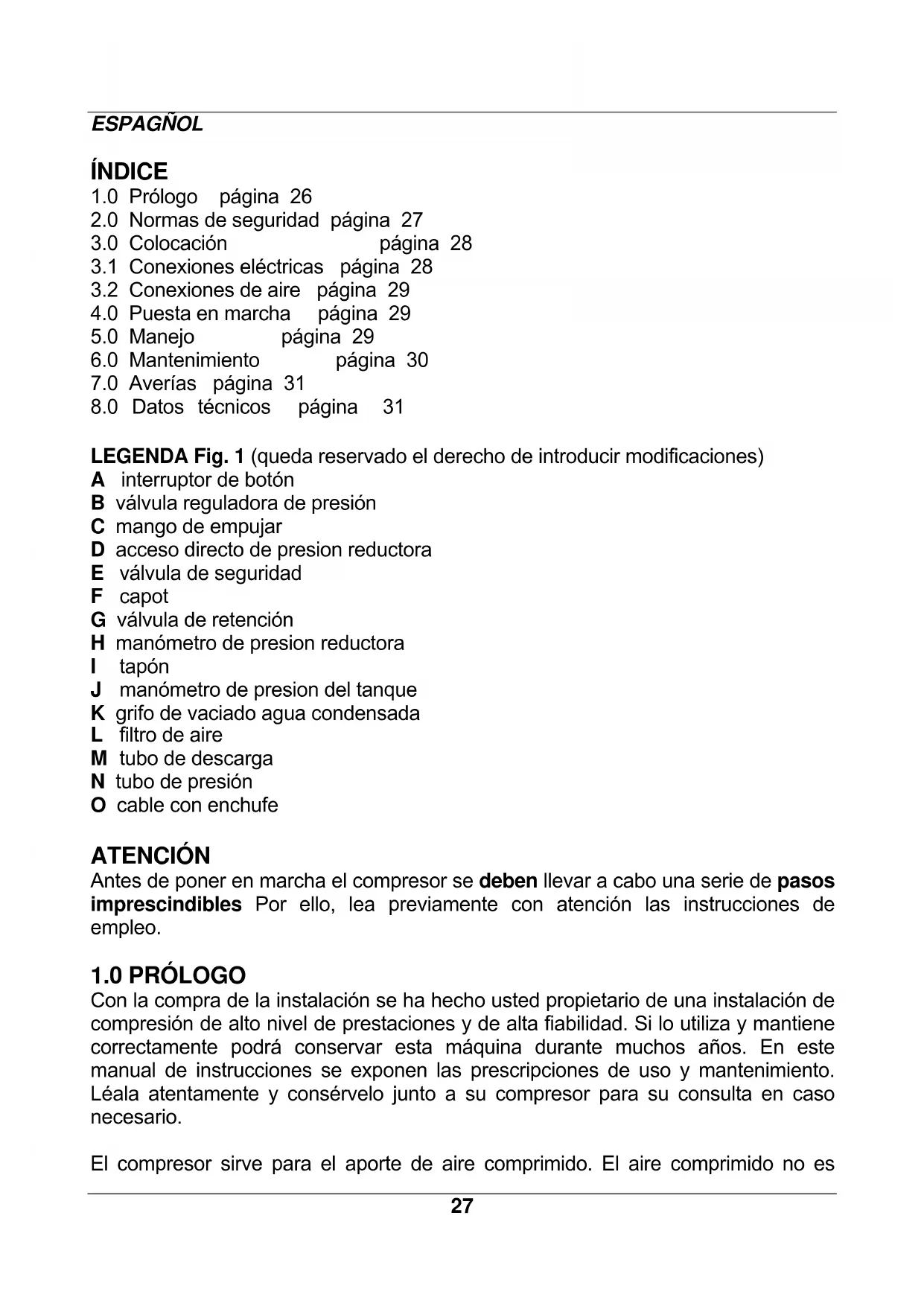 LEGENDA Fig. 1 (queda reservado el derecho de introducir modificaciones) A interruptor de botón B válvula reguladora de presión C mango de empujar D acceso directo de presion reductora E válvula de seguridad F capot G válvula de retención H manómetro de presion reductora I tapón J manómetro de presion del tanque K grifo de vaciado agua condensada L filtro de aire M tubo de descarga N tubo de presión O cable con enchufe ATENCIÓN Antes de poner en marcha el compresor se deben llevar a cabo una serie de pasos imprescindibles Por ello, lea previamente con atención las instrucciones de empleo.