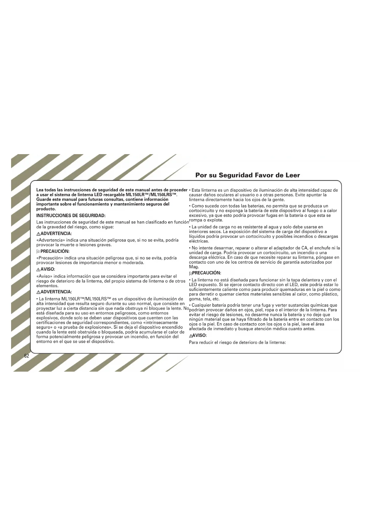 - La linterna ML150LR™/ML150LRS™ es un dispositivo de iluminación de alta intensidad que resulta seguro durante su uso normal, que consiste en proyectar luz a cierta distancia sin que nada obstruya ni bloquee la lente. No está diseñada para su uso en entornos peligrosos, como entornos explosivos, donde solo se deben usar dispositivos que cuenten con las certificaciones de seguridad correspondientes, como «intrínsecamente seguro» o «a prueba de explosiones». Si se deja el dispositivo encendido cuando la lente esté obstruida o bloqueada, podría acumularse el calor de forma potencialmente peligrosa y provocar un incendio, en función del entorno en el que se use el dispositivo.