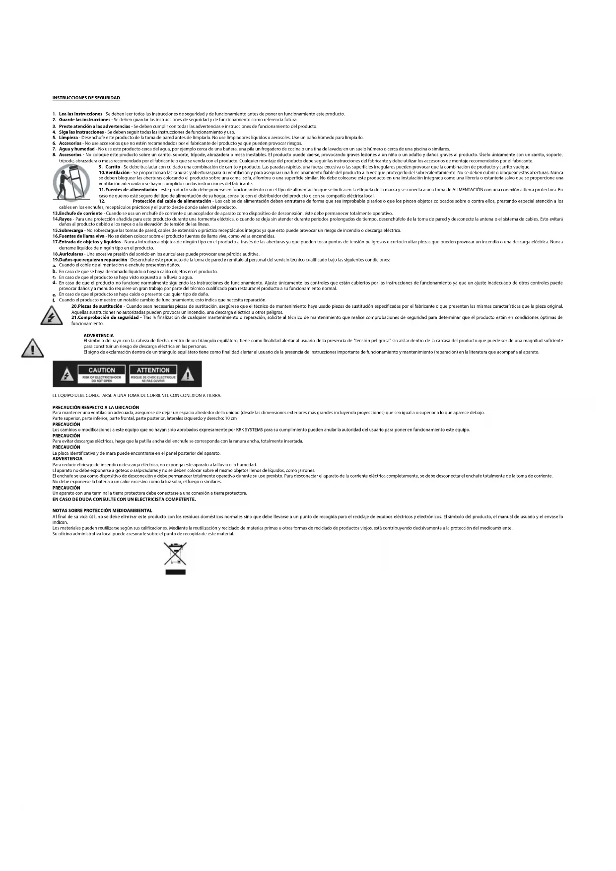 EL EQUIPO DEBE CONECTARSE A UNA TOMA DE CORRIENTE CON CONEXIÓN A TIERRA. PRECAUCIÓN RESPECTO A LA UBICACIÓN Para mantener una ventilación adecuada, asegúrese de dejar un espacio alrededor de la unidad (desde las dimensiones exteriores más grandes incluyendo proyecciones) que sea igual a o superior a lo que aparece debajo. Parte superior, parte inferior, parte frontal, parte posterior, laterales izquierdo y derecho: 10 cm PRECAUCIÓN Los cambios o modificaciones a este equipo que no hayan sido aprobados expresamente por KRK SYSTEMS para su cumplimiento pueden anular la autoridad del usuario para poner en funcionamiento este equipo. PRECAUCIÓN Para evitar descargas eléctricas, haga que la patilla ancha del enchufe se corresponda con la ranura ancha, totalmente insertada. PRECAUCIÓN La placa identificativa y de mara puede encontrarse en el panel posterior del aparato. ADVERTENCIA Para reducir el riesgo de incendio o descarga eléctrica, no exponga este aparato a la lluvia o la humedad. El aparato no debe exponerse a goteos o salpicaduras y no se deben colocar sobre el mismo objetos llenos de líquidos, como jarrones. El enchufe se usa como dispositivo de desconexión y debe permanecer totalmente operativo durante su uso previsto. Para desconectar el aparato de la corriente eléctrica completamente, se debe desconectar el enchufe totalmente de la toma de corriente. No debe exponerse la batería a un calor excesivo como la luz solar, el fuego o similares. PRECAUCIÓN Un aparato con una terminal a tierra protectora debe conectarse a una conexión a tierra protectora. EN CASO DE DUDA CONSULTE CON UN ELECTRICISTA COMPETENTE.