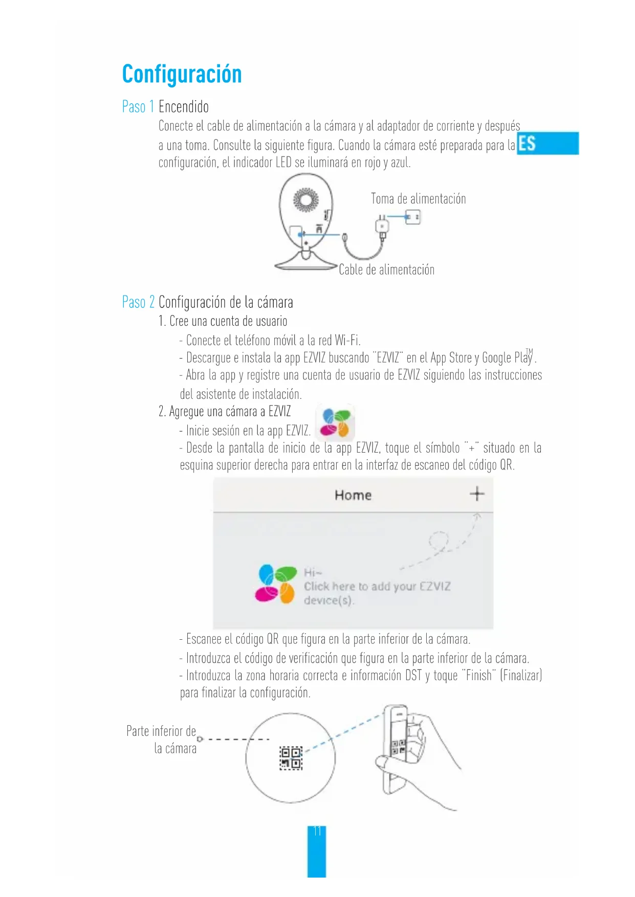 - Inicie sesión en la app EZVIZ. - Desde la pantalla de inicio de la app EZVIZ, toque el símbolo “+” situado en la esquina superior derecha para entrar en la interfaz de escaneo del código QR. - Escanee el código QR que figura en la parte inferior de la cámara. - Introduzca el código de verificación que figura en la parte inferior de la cámara. - Introduzca la zona horaria correcta e información DST y toque “Finish” (Finalizar) para finalizar la configuración. Cable de alimentación Toma de alimentación Parte inferior de la cámara12