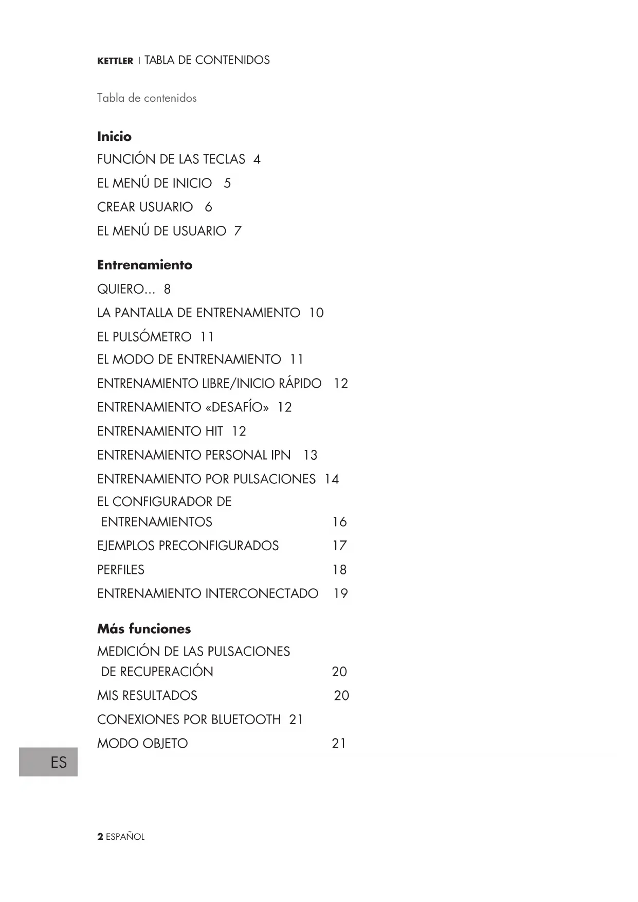P1_Kettler_Handbuch_170629_01.indd 8 29.06.17 12:30ENTRENAMIENTO | KETTLER ESPAÑOL 9 30 min. fitness Pág. 14 El entrenamiento de 30 minutos en la zona «fit- ness». El programa se guía por sus pulsaciones. Entrenamiento personal IPN Pág. 13 Deje que el entrenador que incluye nuestro apa- rato le entrene. Obtendrá un entrenamiento he- cho a medida. Entrenamiento en la zona verde Pág. 14 Si la pantalla se ilumina en verde, está entrenando en la zona para quemar grasas. Gracias a la fun- ción de pulsómetro tendrá una vista general. Entrenamiento HIT Pág. 12 El turbo para su entrenamiento. Cinco intervalos muy intensos que fortalecerán su sistema cardio- vascular y le ayudarán a quemar grasas. Entrenamiento personal IPN Pág. 13 Déjese asesorar por el entrenador del dispositivo, que le proporcionará un entrenamiento a medida. 30 min. fatburn Pág. 14 El entrenamiento de 30 minutos en la zona para quemar grasas. El programa se guía por sus pul- saciones. Entrenamiento en la zona amarilla Pág. 14 Si la pantalla se ilumina en amarillo, está entre- nando en la zona «fitness». Gracias a la función de pulsómetro tendrá una vista general. Entrenamiento HIT Pág. 12 El turbo para su entrenamiento. Cinco intervalos de alta intensidad que fortalecerán... vascular y le ayudarán a quemar grasa. Entrenamiento personal IPN Pág. 13 Deje que el entrenador que incluye nuestro apa- rato le entrene. Obtendrá un entrenamiento he- cho a medida. Quiero un entrenamiento personalizado Quiero mejorar mi forma física. Quiero adelgazar un par de kilos