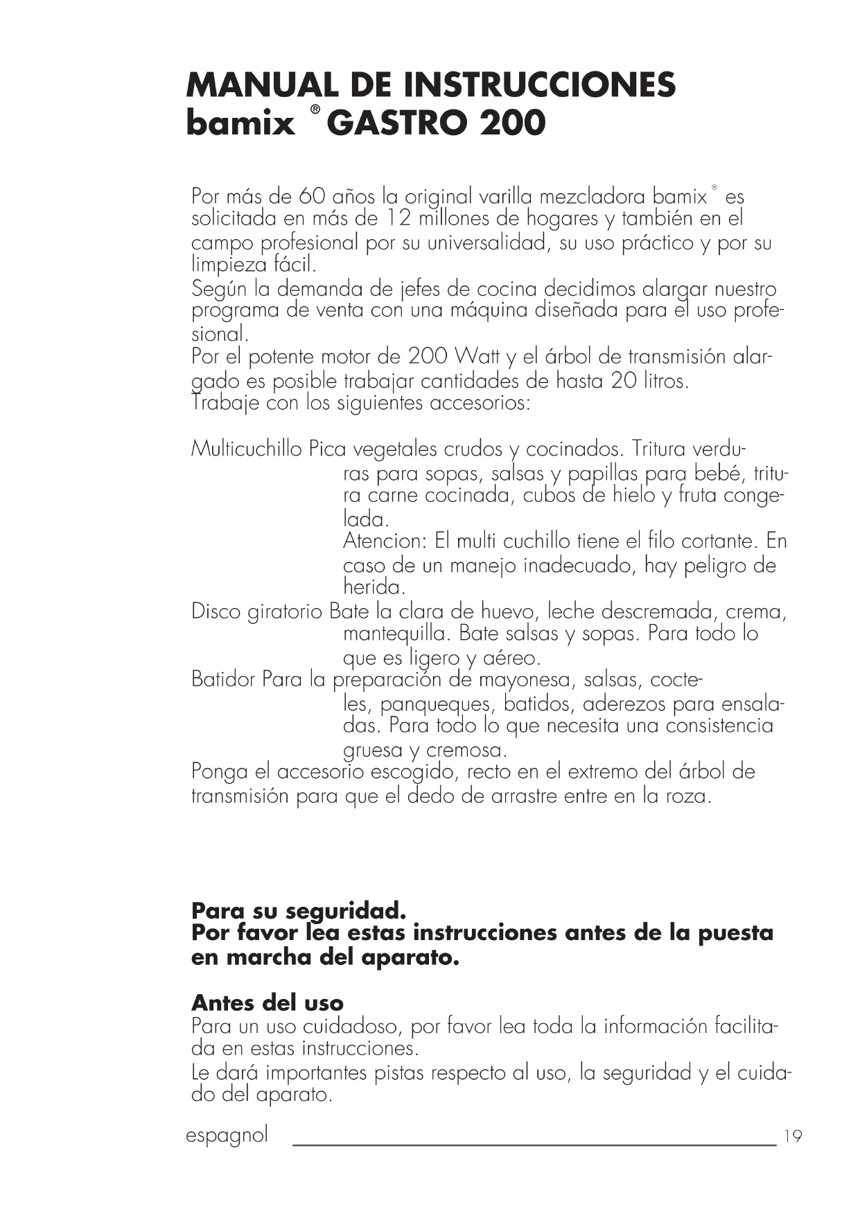 GASTRO 20020 espagnol Mantenga estas instrucciones cuidadosamente y páselas al siguien- te usuario. El aparato solo debiera ser empleado para propósitos según estas instrucciones de uso. Tenga en cuenta las indicaciones de seguridad Prescripciones de seguridad para bamix