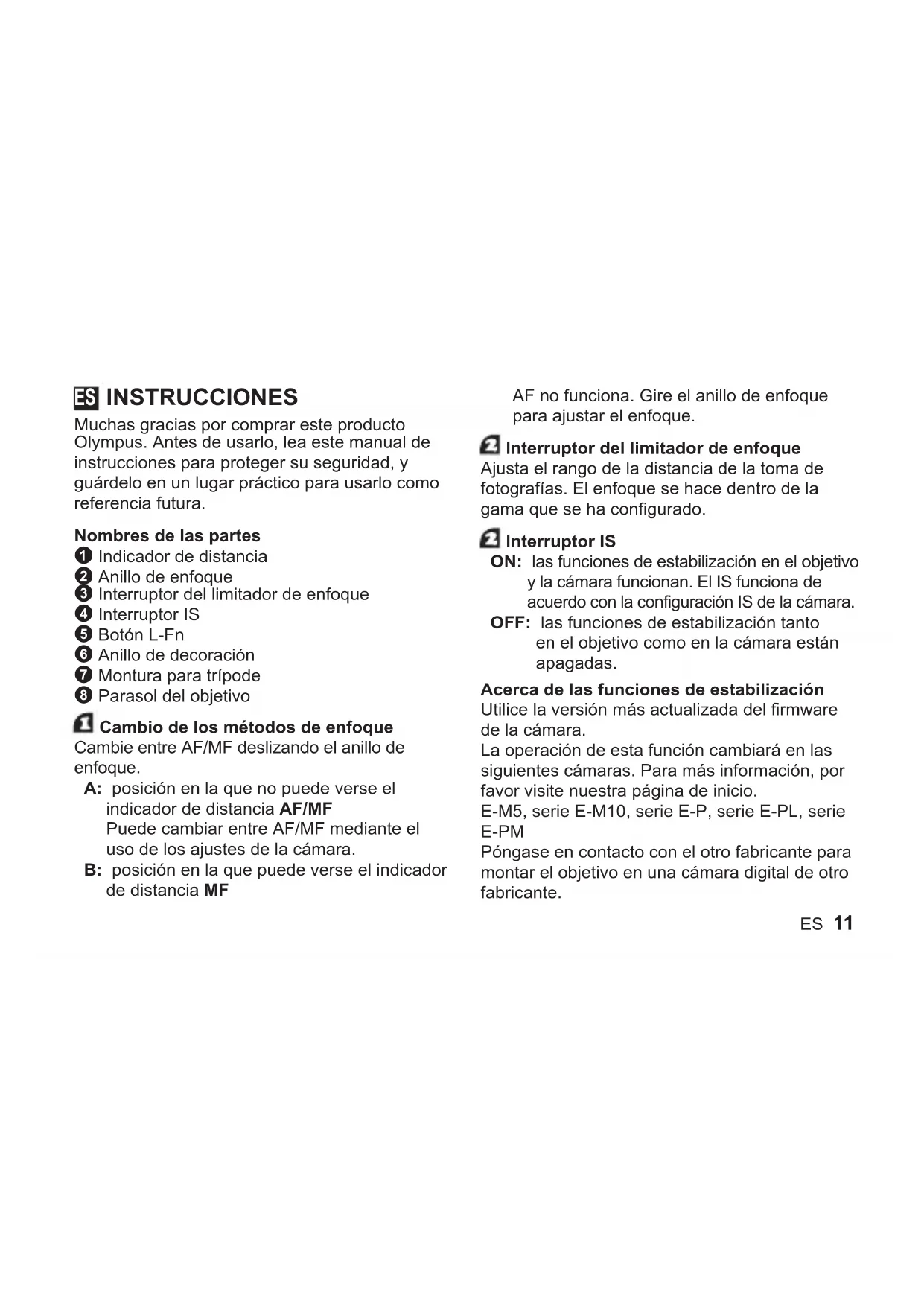 - ES 11 INSTRUCCIONES Muchas gracias por comprar este producto Olympus. Antes de usarlo, lea este manual de instrucciones para proteger su seguridad, y guárdelo en un lugar práctico para usarlo como referencia futura. Nombres de las partes 1 Indicador de distancia 2 Anillo de enfoque 3 Interruptor del limitador de enfoque 4 Interruptor IS 5 Botón L-Fn 6 Anillo de decoración 7 Montura para trípode 8 Parasol del objetivo Cambio de los métodos de enfoque Cambie entre AF/MF deslizando el anillo de enfoque. A: posición en la que no puede verse el indicador de distancia AF/MF Puede cambiar entre AF/MF mediante el uso de los ajustes de la cámara. B: posición en la que puede verse el indicador de distancia MF AF no funciona. Gire el anillo de enfoque para ajustar el enfoque. Interruptor del limitador de enfoque Ajusta el rango de la distancia de la toma de fotografías. El enfoque se hace dentro de la gama que se ha configurado. Interruptor IS ON: las funciones de estabilización en el objetivo y la cámara funcionan. El IS funciona de acuerdo con la configuración IS de la cámara. OFF: las funciones de estabilización tanto en el objetivo como en la cámara están apagadas. Acerca de las funciones de estabilización Utilice la versión más actualizada del firmware de la cámara. La operación de esta función cambiará en las siguientes cámaras. Para más información, por favor visite nuestra página de inicio. E-M5, serie E-M10, serie E-P, serie E-PL, serie E-PM Póngase en contacto con el otro fabricante para montar el objetivo en una cámara digital de otro fabricante. ES12 ES Botón L-Fn AF deja de funcionar mientras se mantiene pulsado el botón. Extracción de la montura para el trípode e instalación del anillo de decoración Extracción de la montura para el trípode: Gire la perilla de la montura para trípode hacia la izquierda para aflojarla 1. Gire la montura para trípode hacia la izquierda, alinéela con la marca 2 y extráigala del cuerpo del objetivo 3. Colocación del anillo de decoración: Alinee las marcas e inserte el anillo de decoración 1 y, a continuación, gírelo hacia la derecha hasta que se detenga 2. Cómo utilizar el parasol del objetivo Tire de él hacia afuera hasta que se detenga 1 y, a continuación, gírelo a la derecha 2. No se puede retirar el parasol del objetivo. Notas sobre la toma fotográfica